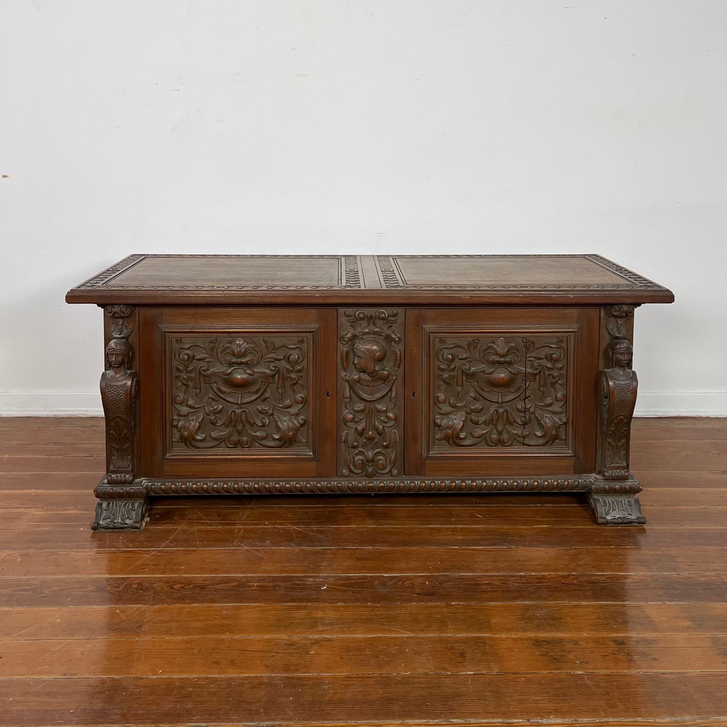 Arcón estilo renacimiento italiano en madera tallada «flores y guerreros», con dos puertas frontales. 56 x 137 x 52 cm.