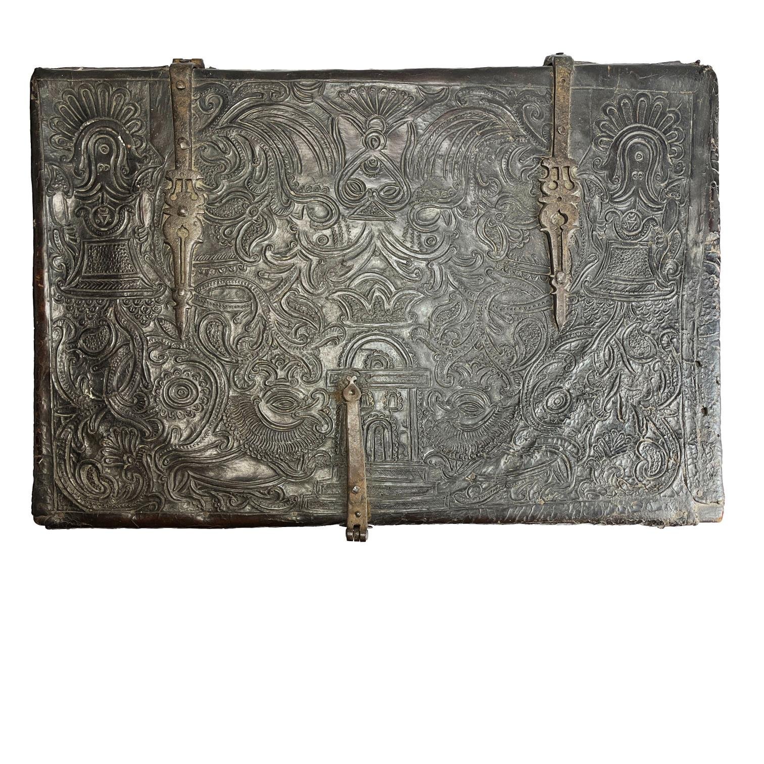 Arcón hispanoamericano s. XVIII en madera totalmente forrada en cuero repujado «animales hojas y flores» con restos de policromía. Herrajes, cerradura y asas laterales en hierro forjado y calado. 20 x 52 x 36 cm.