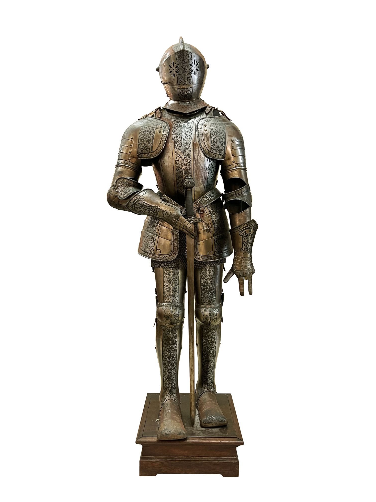 Armadura española s. XIX en hierro grabado al ácido «arabescos y máscaras», con espada. Alto 175 cm. Presentada sobre peana de madera. Alto total 195 cm. Faltantes en dedos.