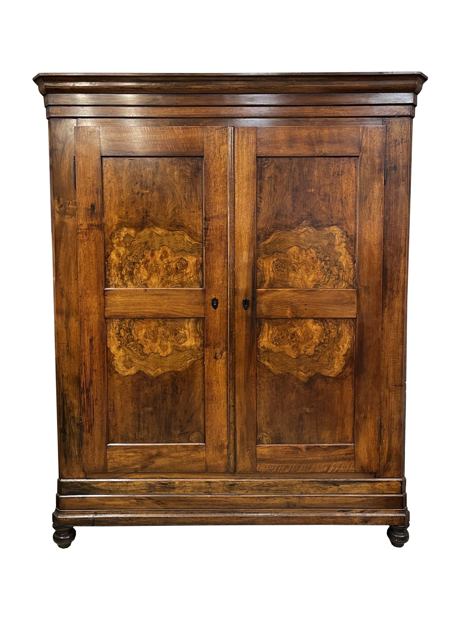 Armario inglés con puertas enchapadas en raíz de nogal. Bocallaves en ébano. Interior tapizado y forrado con espejos, con dos estantes de vidrio. 210 x 175 x 60 cm.