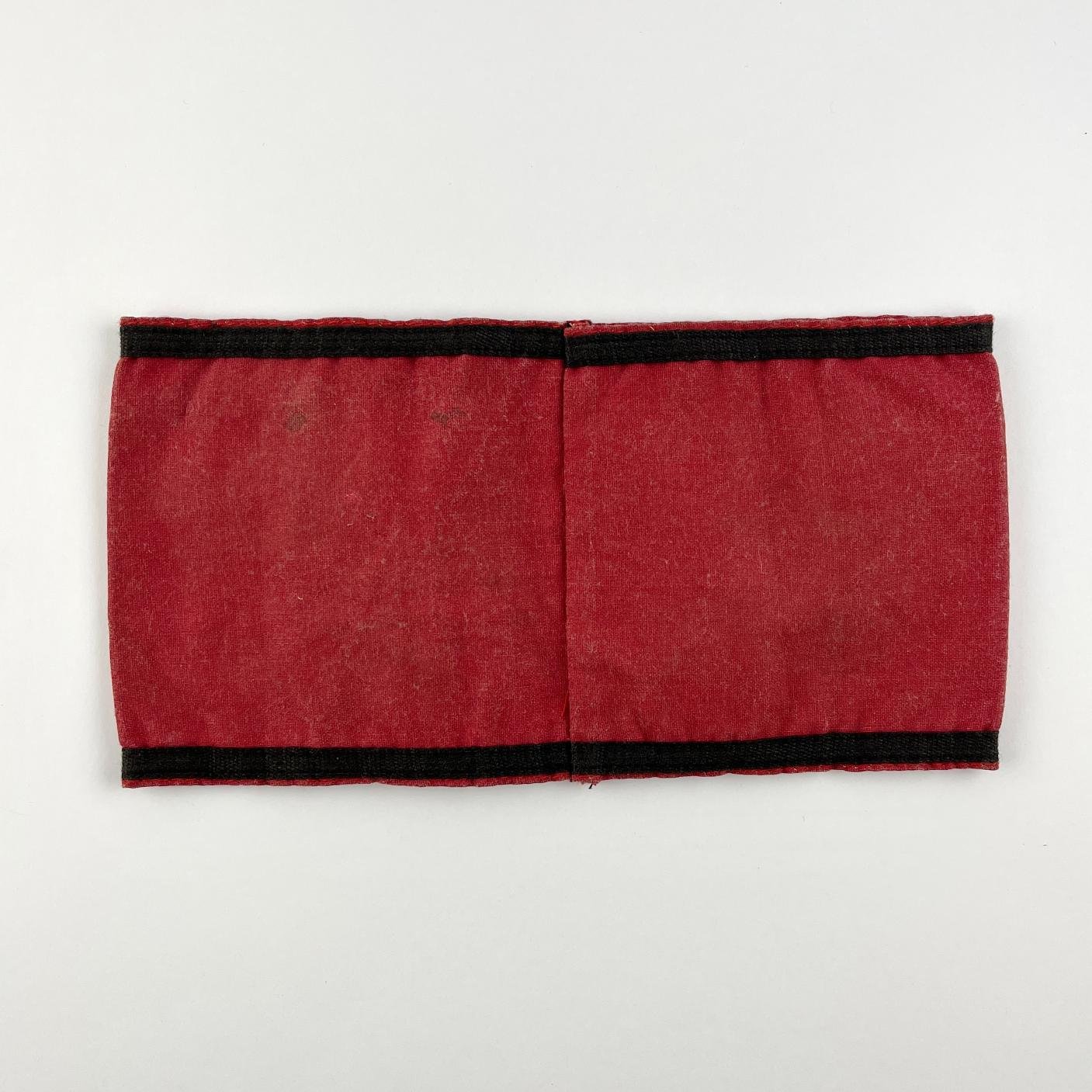 Brazalete o “armelbinde” alemán época nacionalsocialista para miembro del NSDAP, en tela roja con borde de cinta negra cosido y disco blanco con esvástica estampada. 44 x 10 cm.