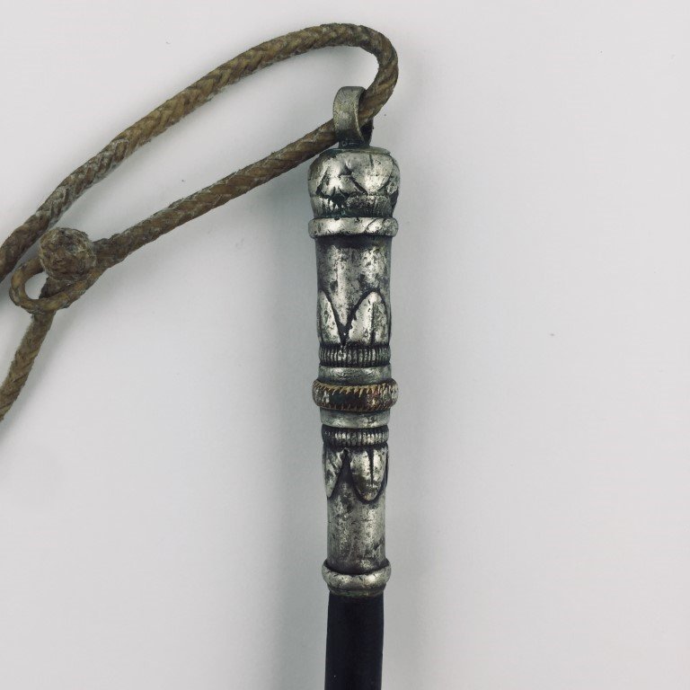 Arreador en bigote de ballena. Cabo, pasador y puntera en plata y oro cincelados «hojas». Sotera en cuero crudo trenzado.