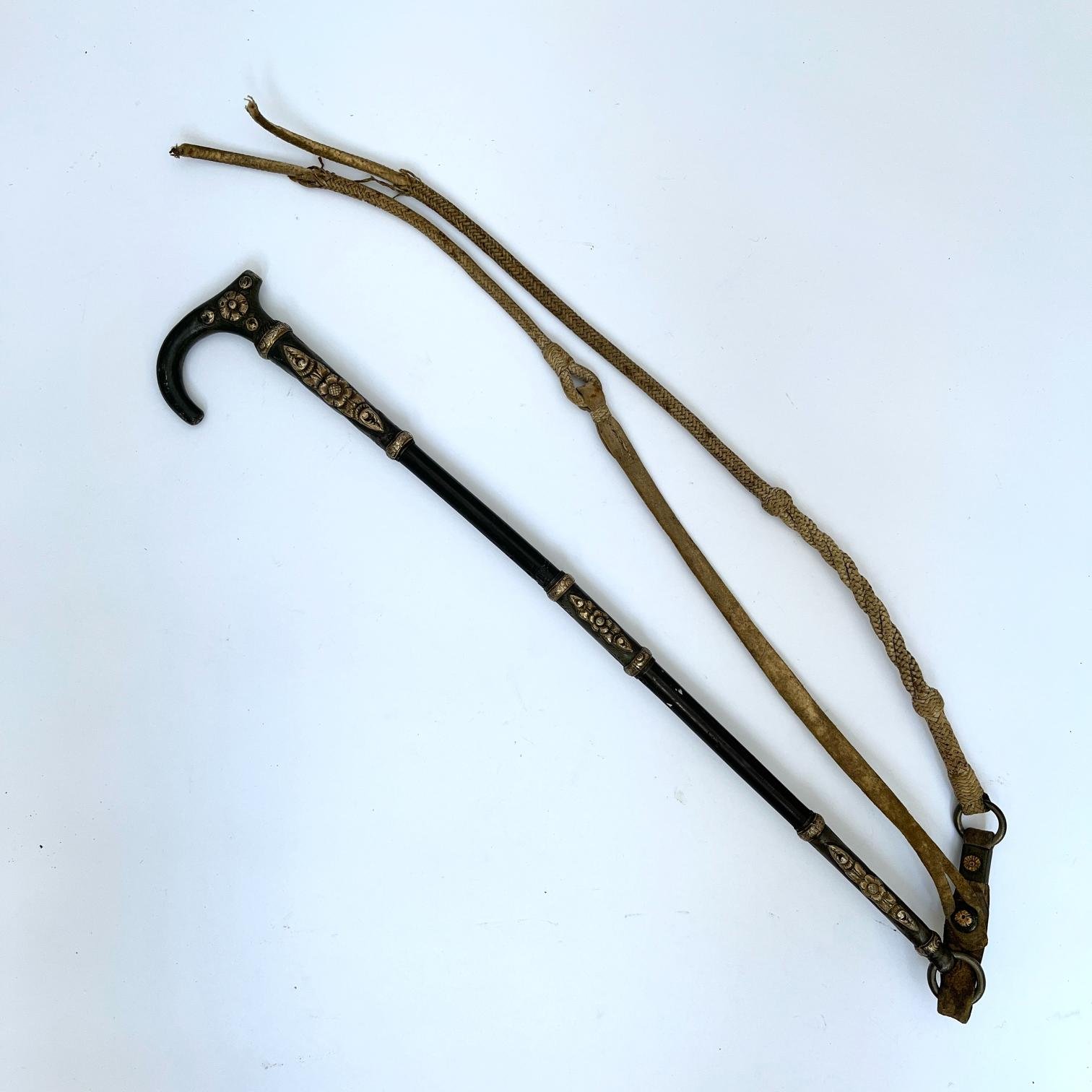 Arreador en bigote de ballena con cabo, pasador y puntera en plata y oro cincelados «hojas y flores». Sotera en cuero crudo trenzado, con pasador y botón en plata y oro cincelados «flores».
