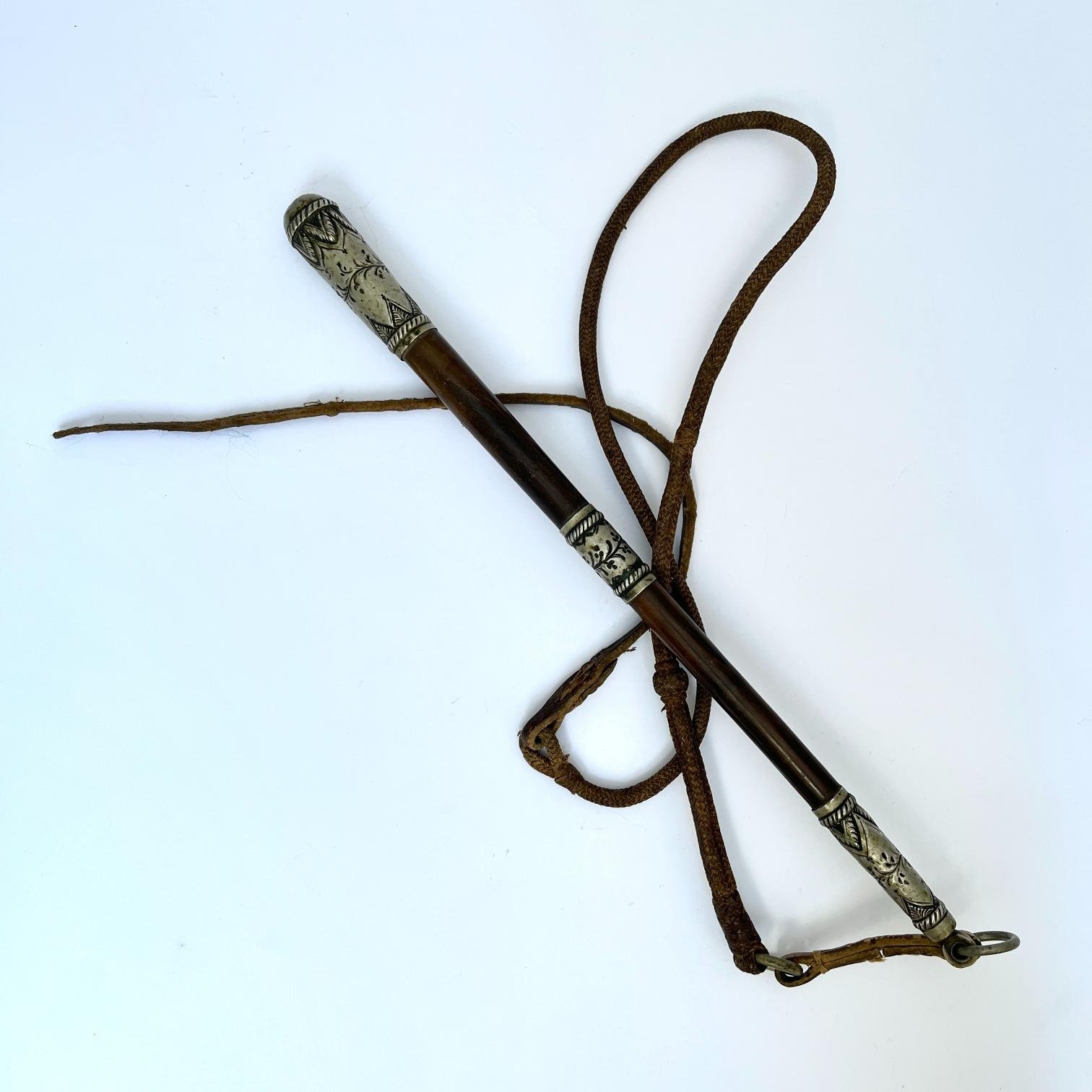Arreador en bigote de ballena con cabo, pasador y puntera en metal decorado «hojas y flores», sellado «Triángulo». Sotera en cuero trenzado.