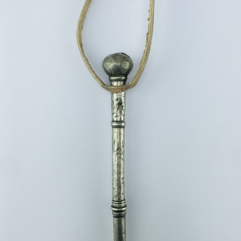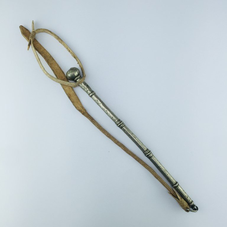 Arreador riograndense en metal Garantido «Coqueiro» de Scholberg & Cía, Pelotas. Cincelado «hojas y flores». Largo de cabo 39 cm. Con abollones. Sotera en fino cuero trenzado.