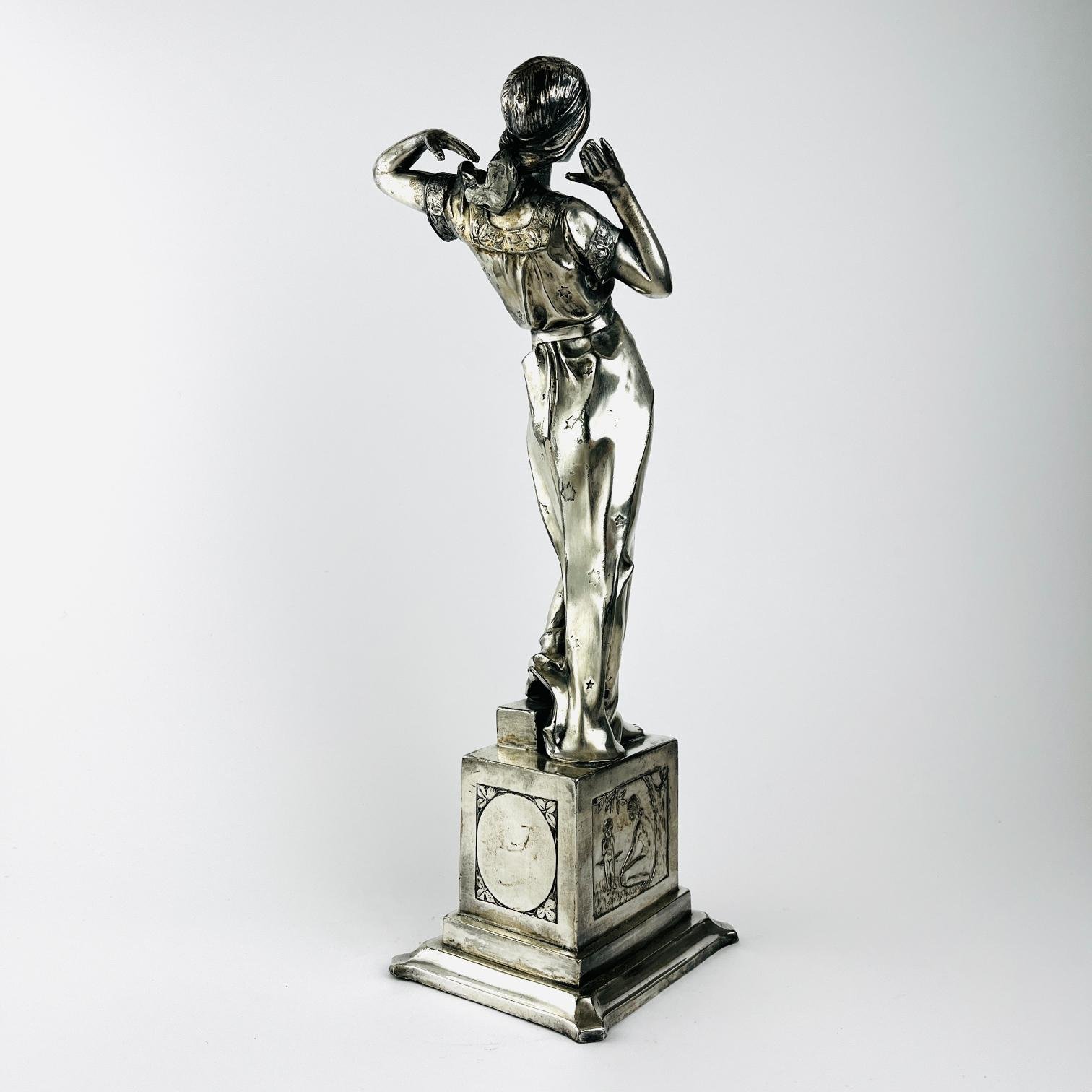 Escultura alemana art decó en metal plateado WMF «Joven dama en pedestal» 32 x 11 x 9 cm