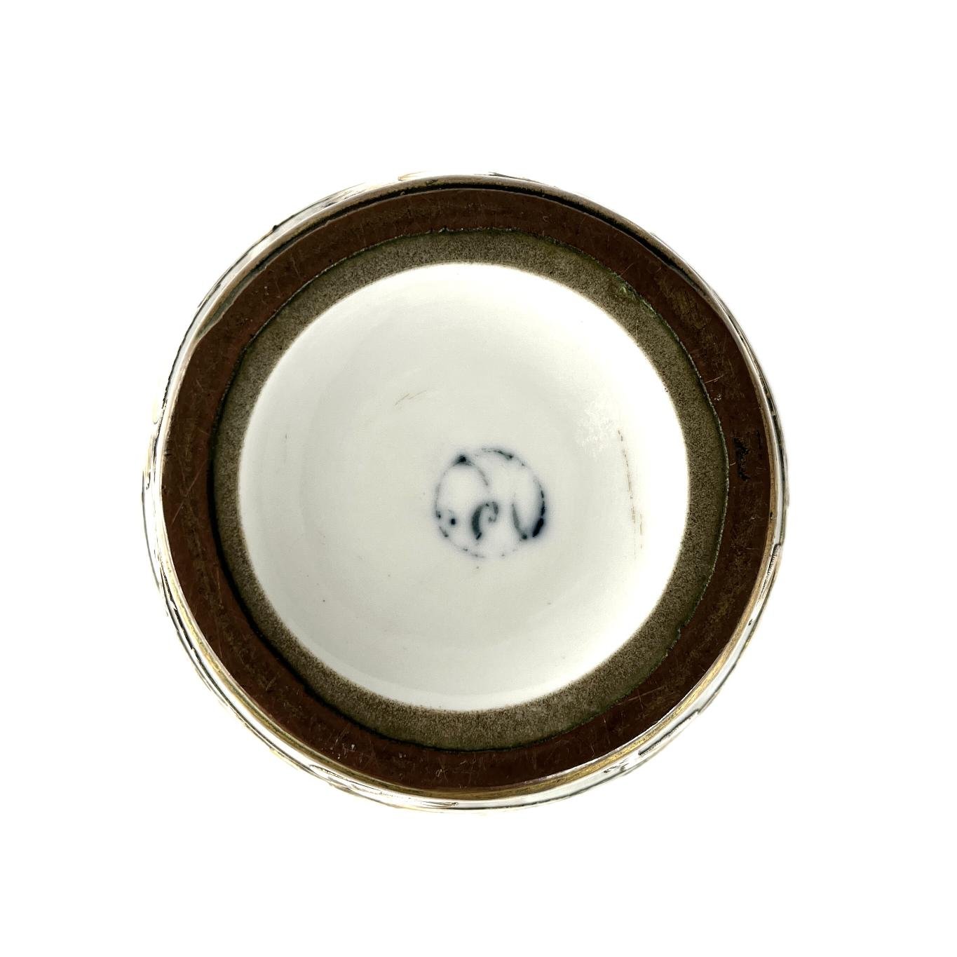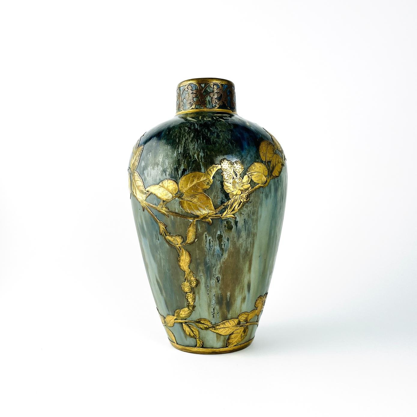 Florero art nouveau en porcelana esmaltada color verde con monturas en bronce calado, cincelado «hojas» y dorado al mercurio. Firmado «Vernes». Alto 24 cm.
