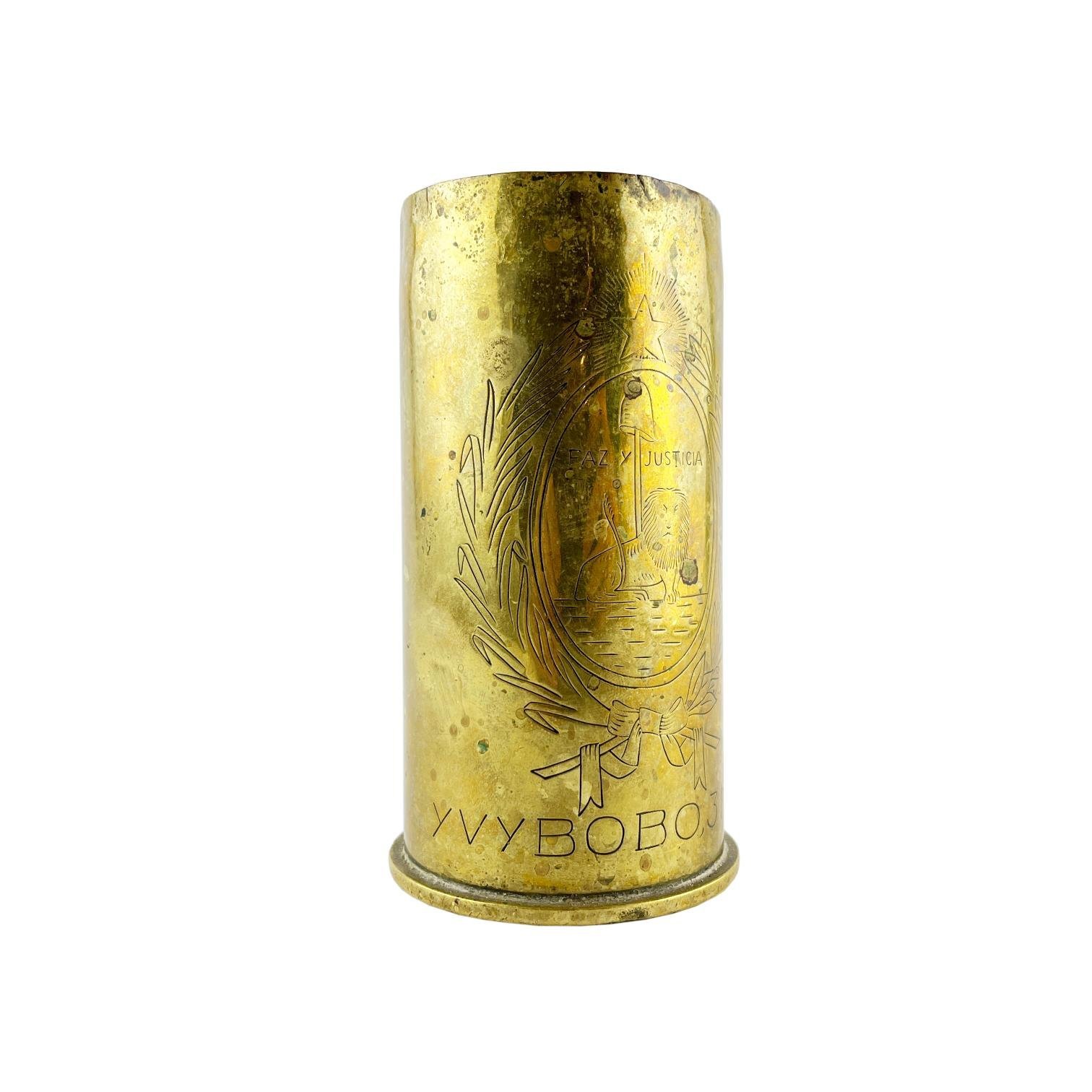 Arte de trinchera realizado con vaina de bala de cañón 65 mm, en bronce, con inscripción “Recuerdo de la campaña del Chaco. Ybybobo. 31/XII/34”, decorado con escudo paraguayo y firmado por el artista “A.G. Varela”. Alto 14 cm.