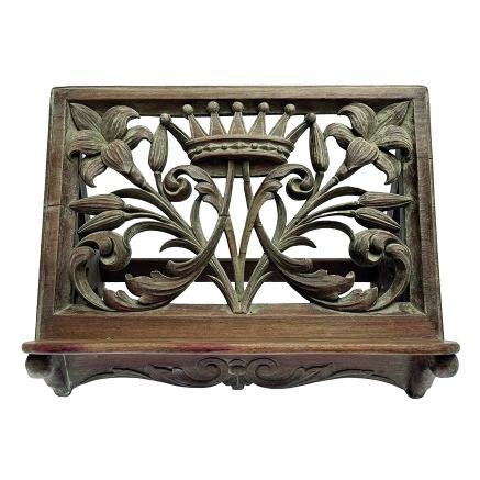 Atril de sobremesa en madera tallada con monograma de la Virgen María con corona y lirios. 27 x 41 x 25 cm.