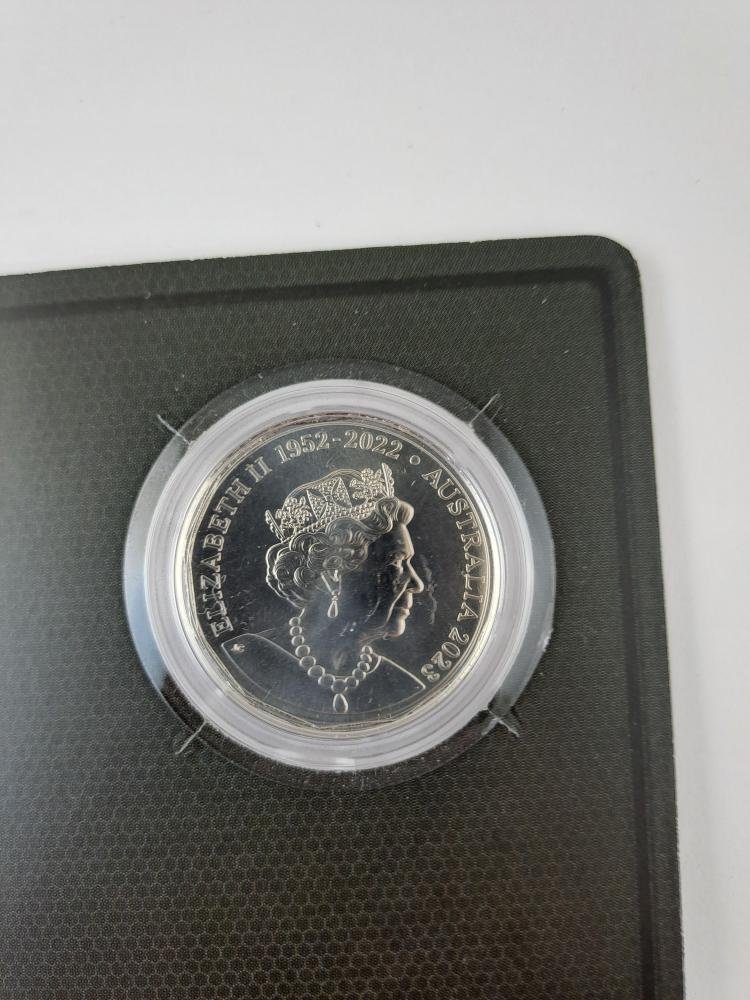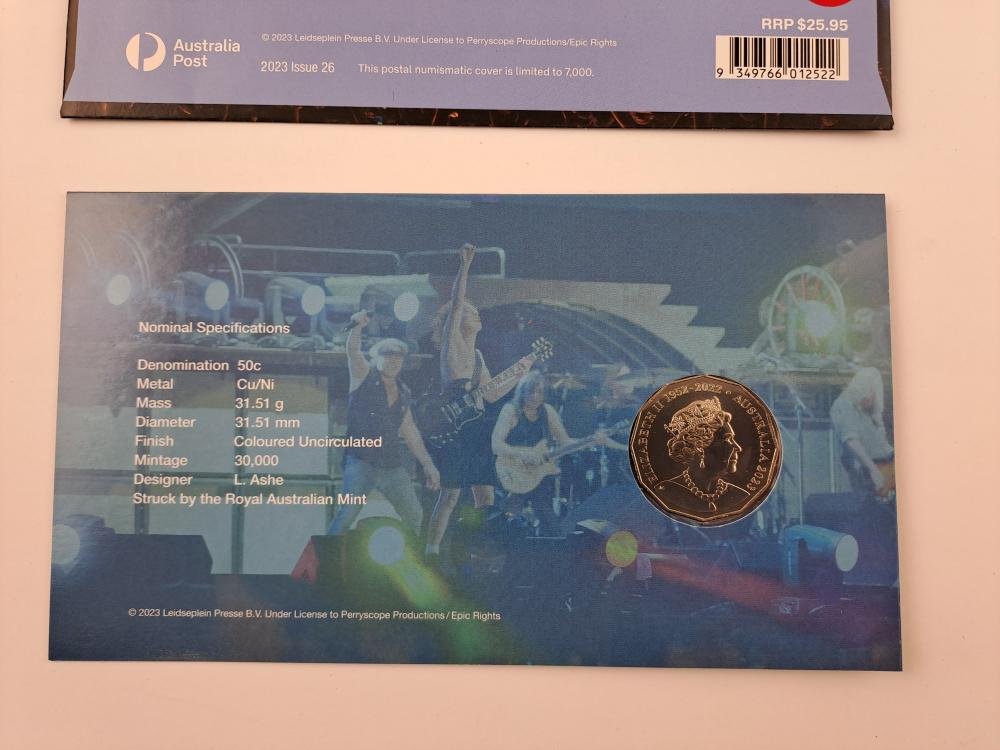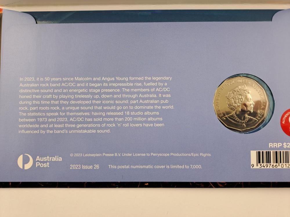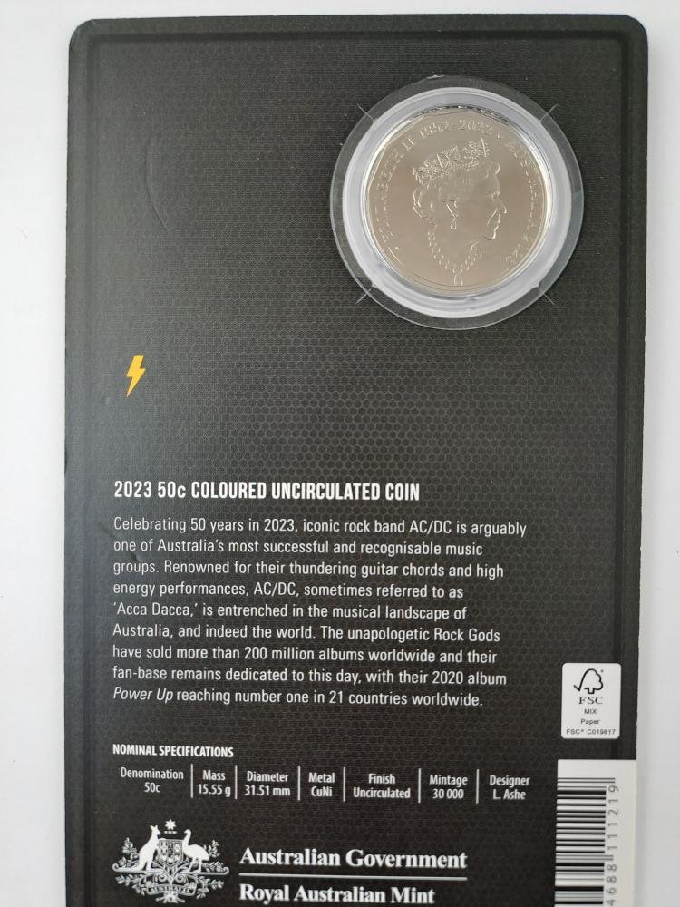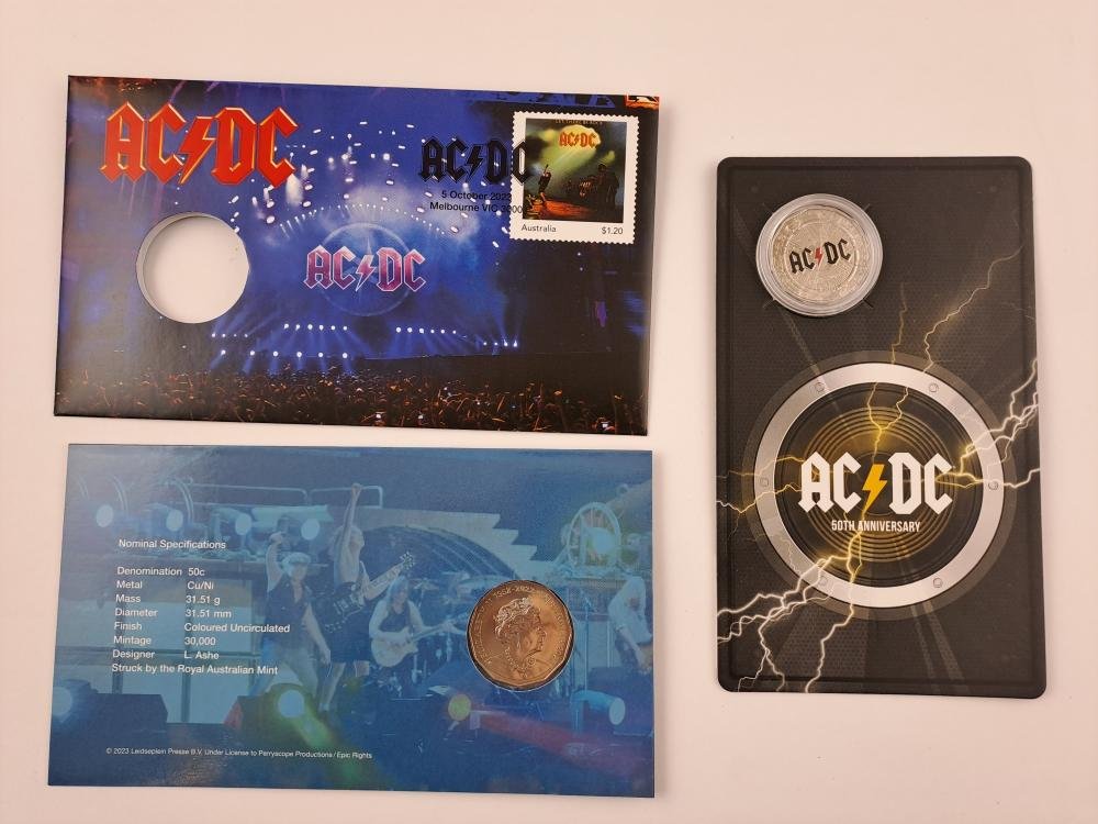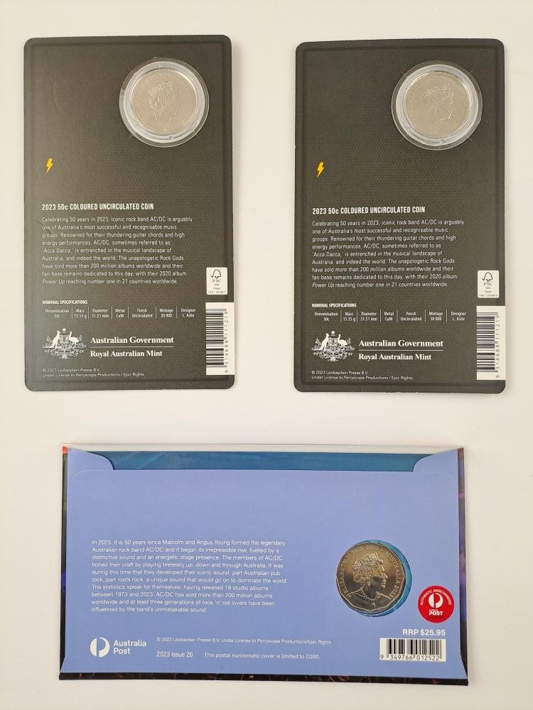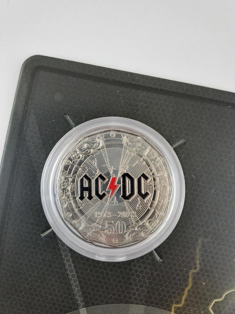 Tres monedas australianas “UNC” en cuproníquel conmemorativas del 50 aniversario de AC/DC, denominaciones 50 cents del año 2023, con logos coloreados. En estuches originales sellados, uno del Australia Post y dos de Australian Government.