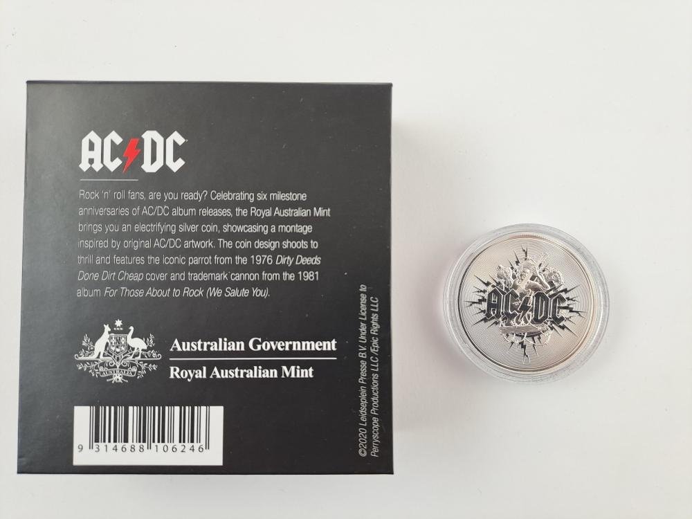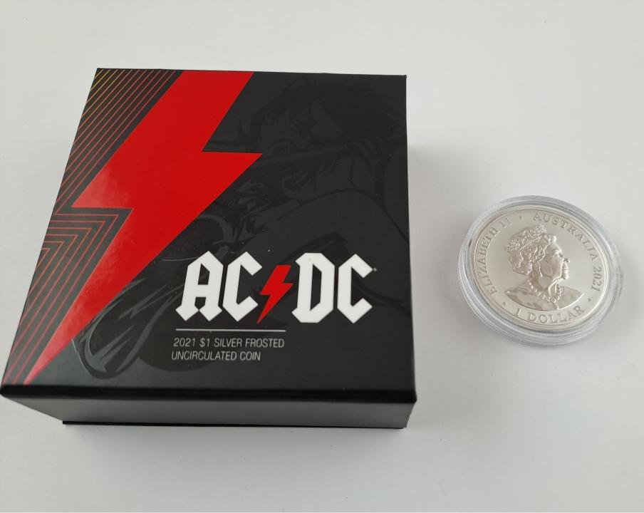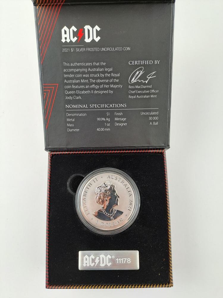 Moneda australiana “UNC” en homenaje a AC/DC, en plata 99,9% denominación 1 dólar del año 2021. “Silver frosted”, en estuche certificado y numerado 11178.