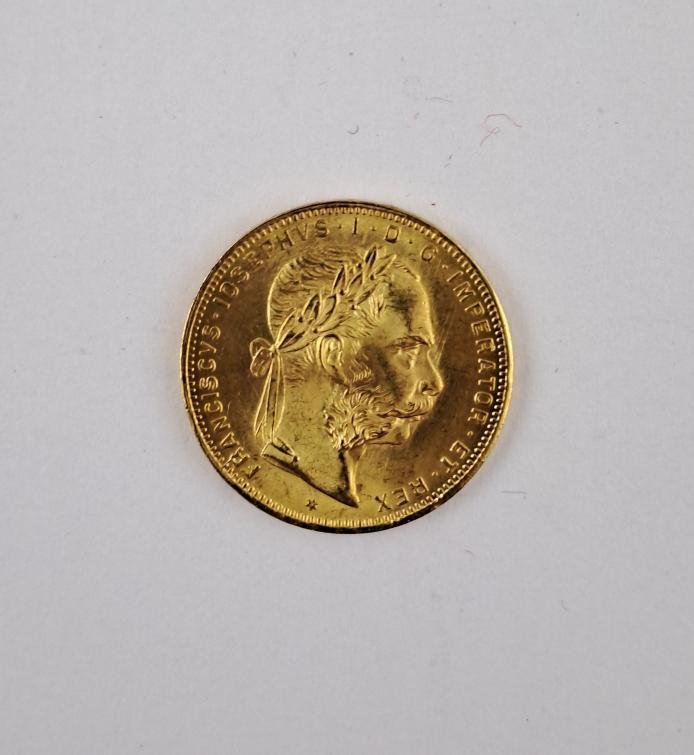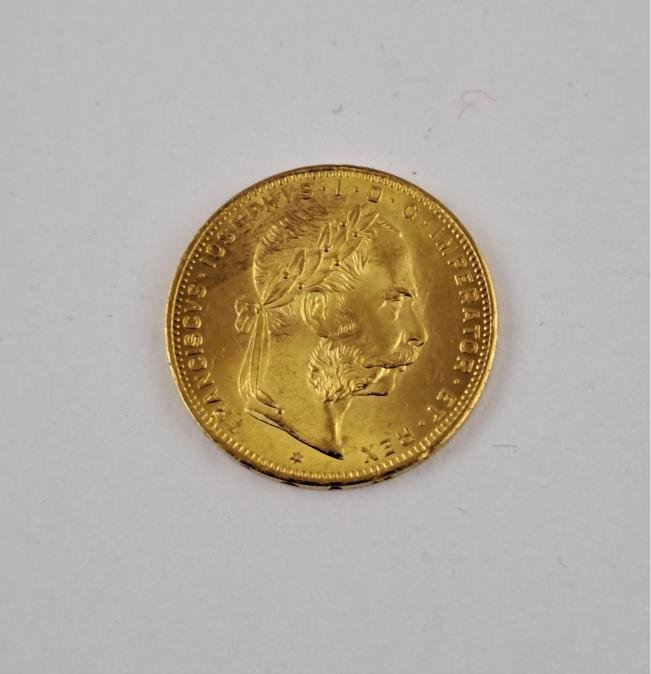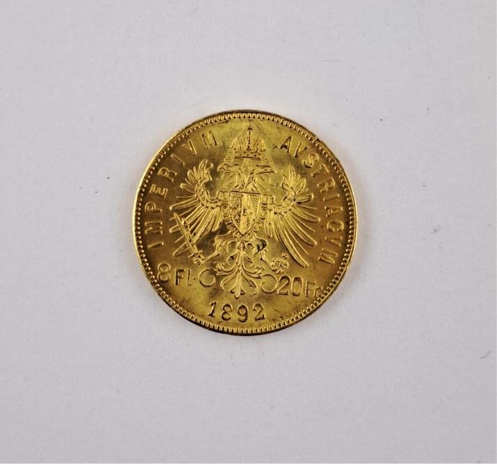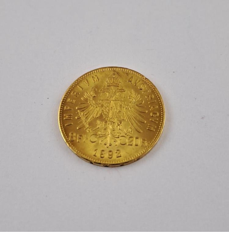 Moneda imperial austríaca en oro 900 denominación 8 florines o 20 francos del año 1892. Peso 6,54 gr.