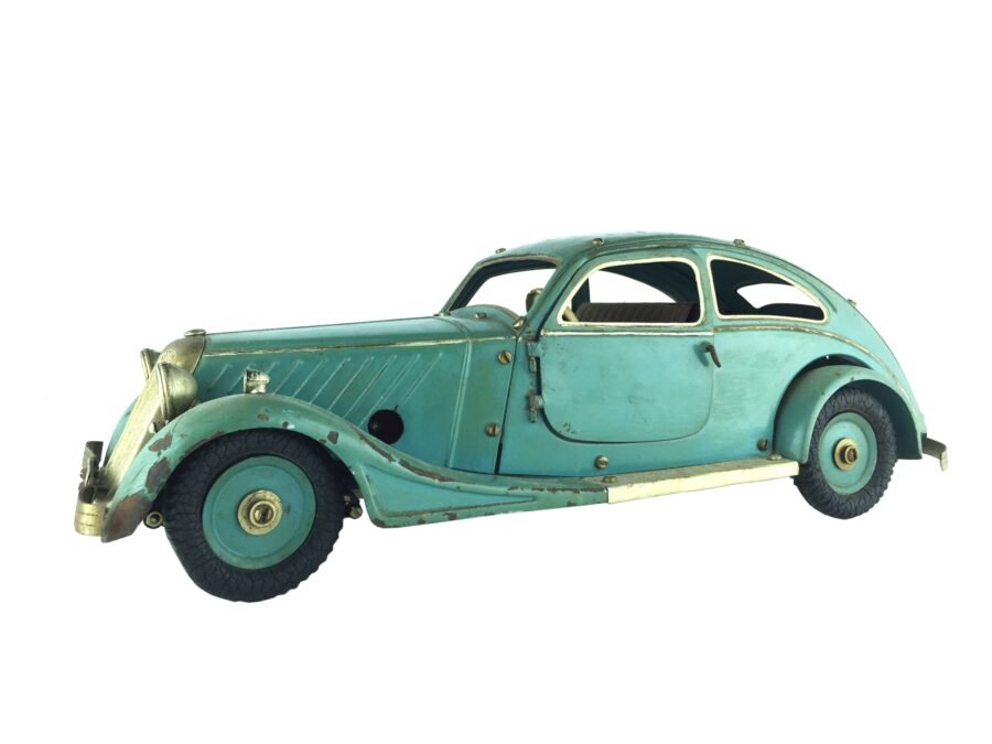 Automóvil a escala a cuerda, en chapa, fabricado por Märklin, modelo Stromlinier Limousine 1935, con referencia «1101». Apertura en puerta de conductor y ruedas de goma. 13 x 37 x 14 cm.