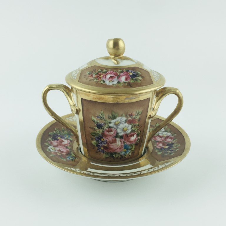 Azucarero con plato en porcelana francesa color blanco decorada «flores», con detalles en oro. Alto total 11 cm.