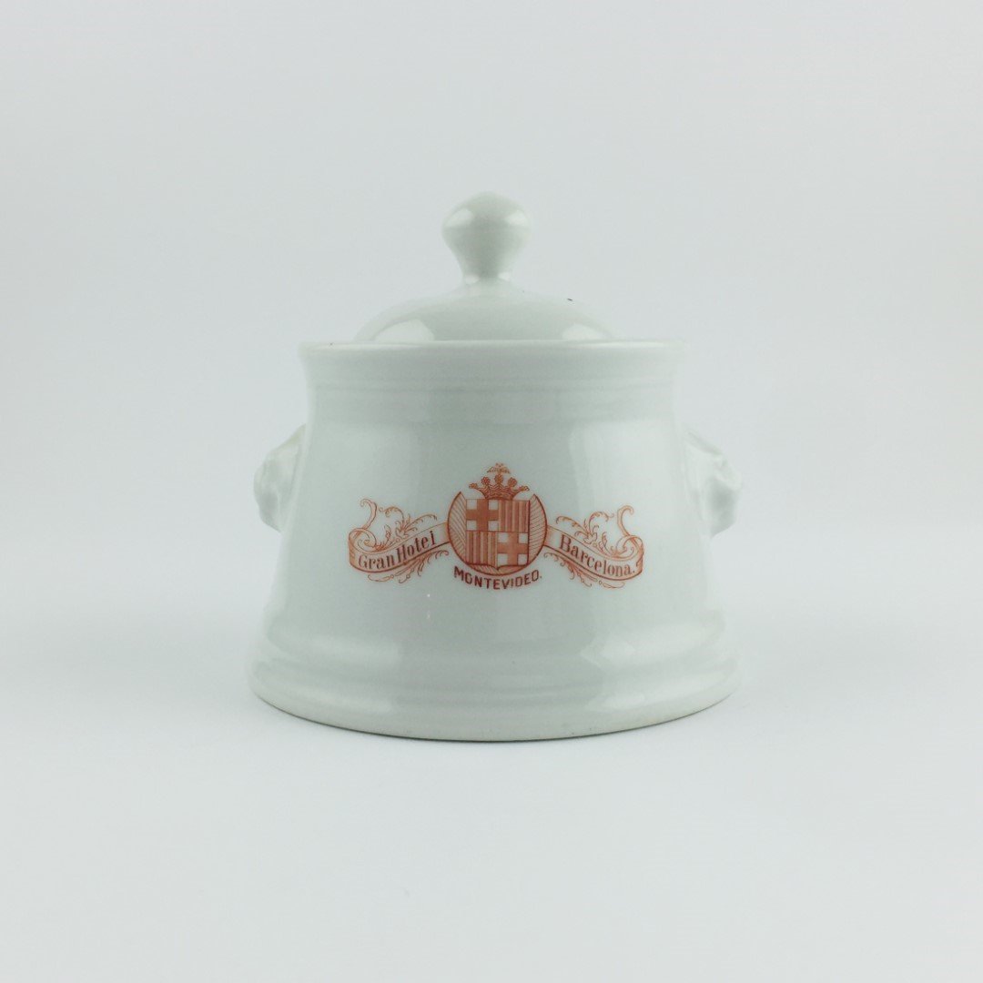 Azucarero en porcelana de Bavaria perteneciente al Gran Hotel Barcelona, Montevideo.