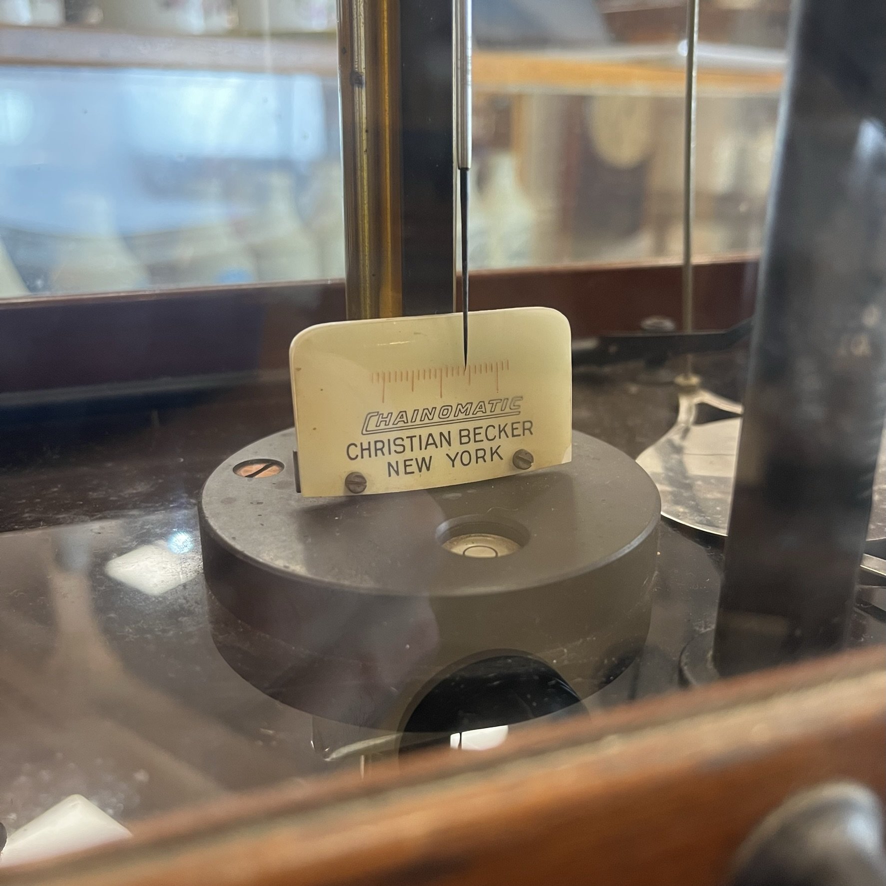 Balanza de precisión, de sobremesa, modelo Chainomatic. Estructura en metal y caja en madera y vidrio. Fabricada por Christian Becker, Nueva York. 49 x 43 x 23 cm. Cristal de base averiado.