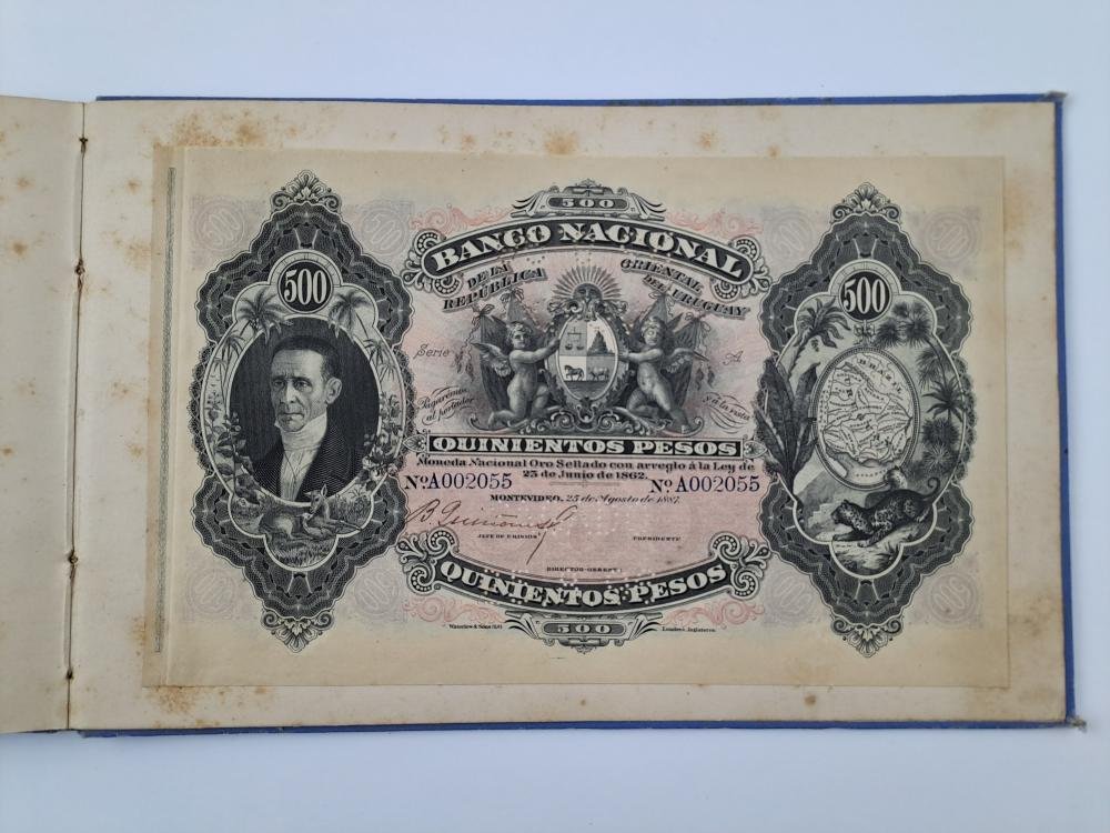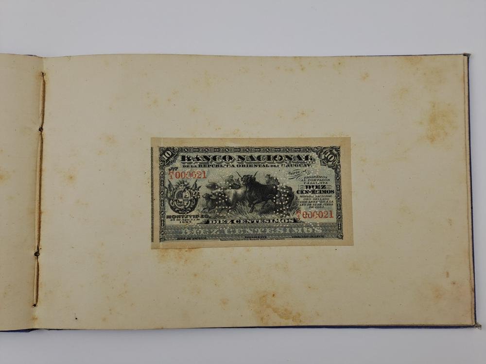 Librillo uruguayo con serie de doce billetes del Banco Nacional con fecha 25 de agosto de 1887: 10, 20 y 50 centésimos, 1, 2, 5, 10, 20, 50, 100, 200 y 500 pesos, inutilizados con sello perforado que dice “PAGADO 25 de agosto de 1896”. Librillo original del Banco.