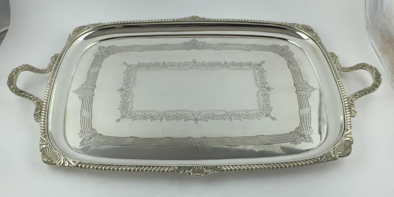 Bandeja de servir rectangular en metal plateado inglés decorado «hojas y flores». Borde estriado decorado «valvas», con asas. 63 x 39 cm.