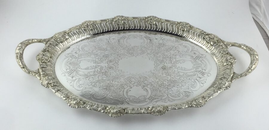 Bandeja de servir rectangular en metal plateado liso. Borde estriado decorado «valvas», con asas. 56 x 34 cm.