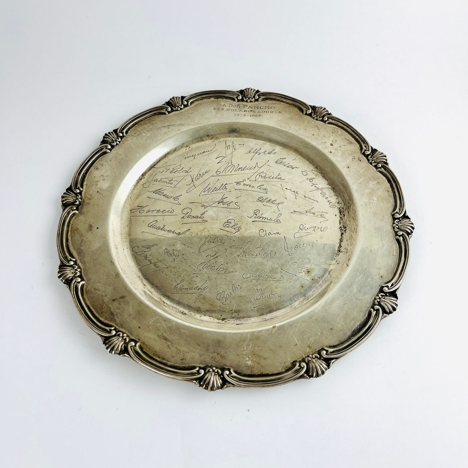 Bandeja en plata con borde en ondas decorado «valvas” e inscripciones grabadas. Diámetro 28 cm. Peso 470 gr.