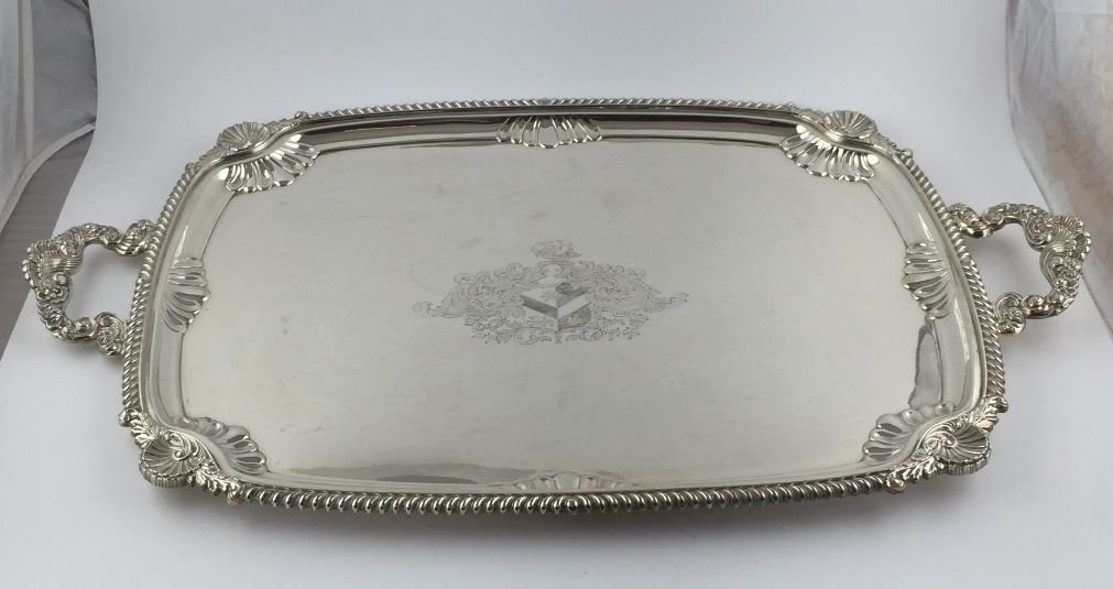 Bandeja inglesa para servir, rectangular, en metal plateado cincelado «blasón». Borde estriado con asas, decorado «valvas y frutos». 69 x 43 cm.