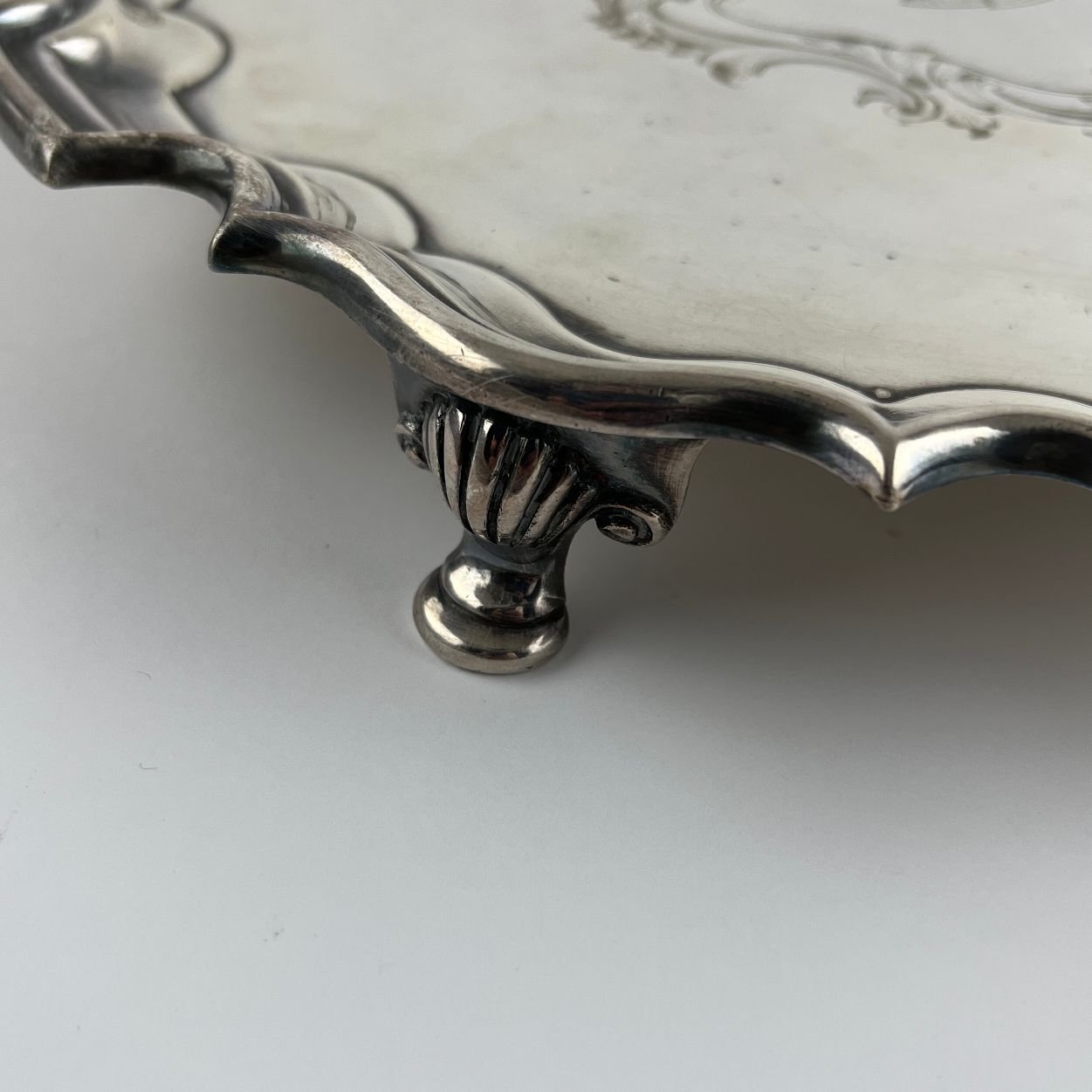Bandeja inglesa redonda en metal plateado y cincelado «blasón», con borde en ondas y tres patas. Diámetro 31.5 cm. Presenta pequeñas manchas y desgastes.
