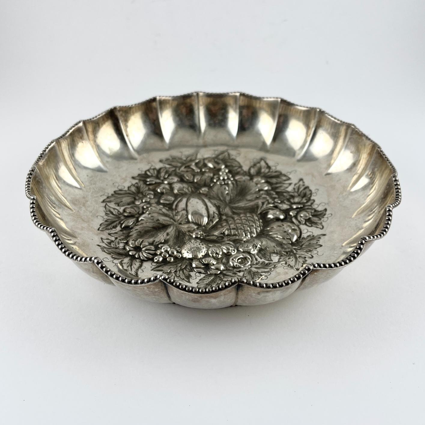 Bandeja inglesa en plata de Sheffield del año 1907, con borde en ondas, perlado, y centro repujado y cincelado «frutos». 4,5 x 23 cm. Peso 500 gr.