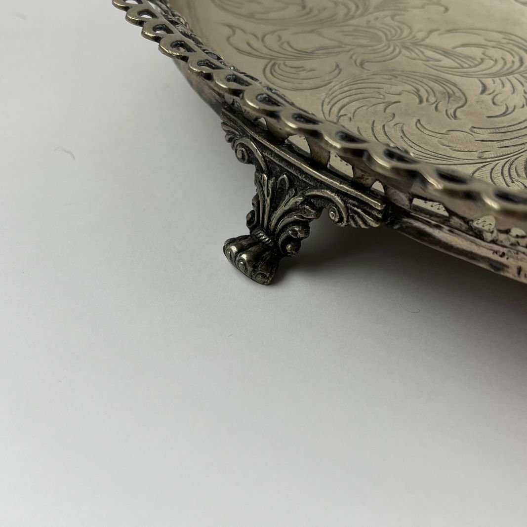 Bandeja portuguesa redonda en plata cincelada “hojas”. Borde calado y decorado «vides». Cuatro patas. Con punzón de la ciudad de Porto. 4.5 x 38.5 cm. Peso 1.250 gr.