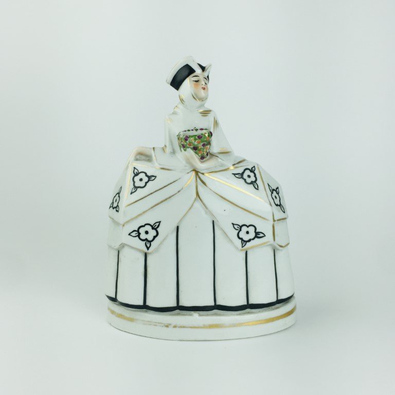 Base de lámpara art decó europea en porcelana policromada esculturada «dama del siglo XVIII». 20 x 16 cm. Entrada para una luz, sin electrificar.