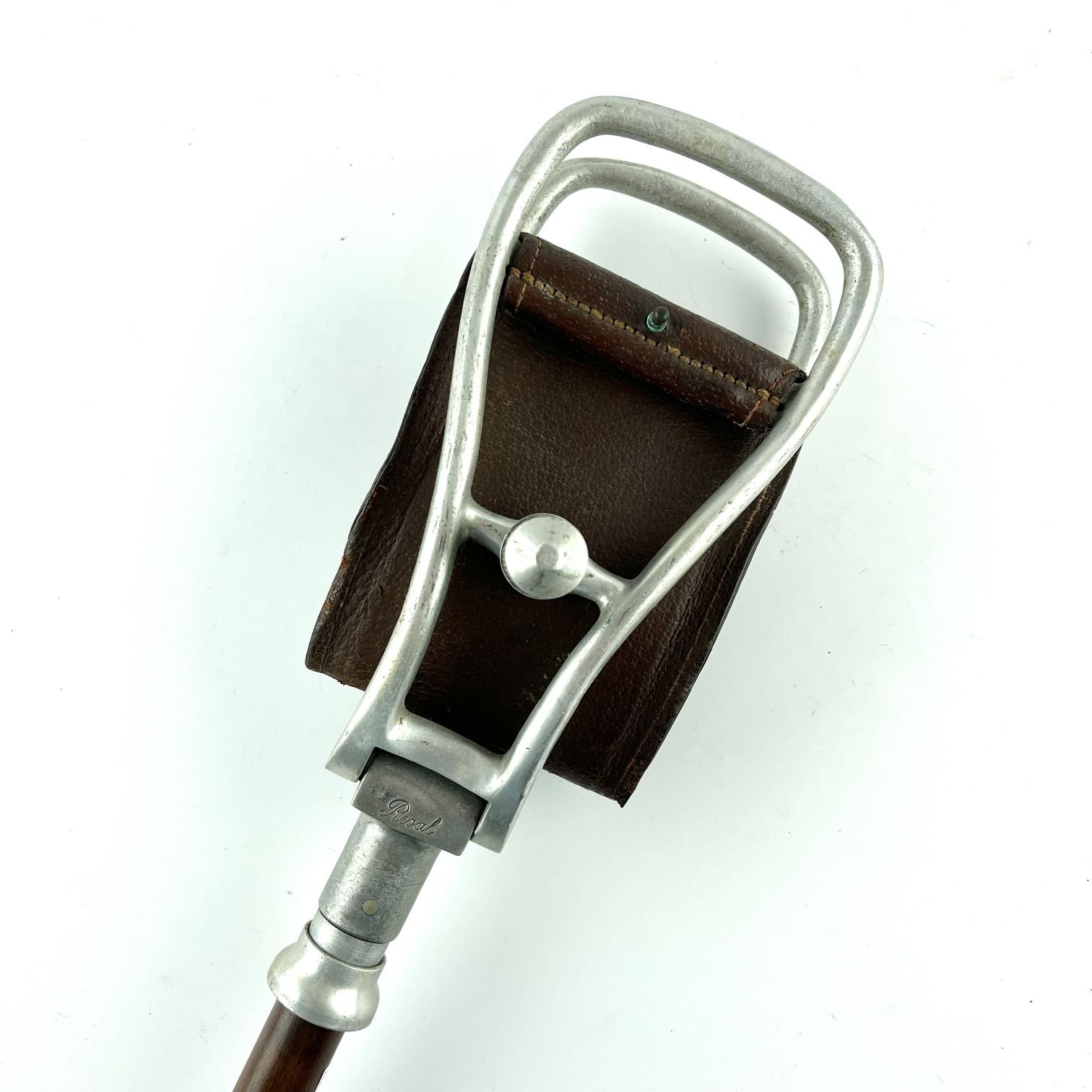 Bastón banqueta inglés fabricado por Regal en madera con asiento en aluminio y cuero color marrón. Alto bastón 95 cm.