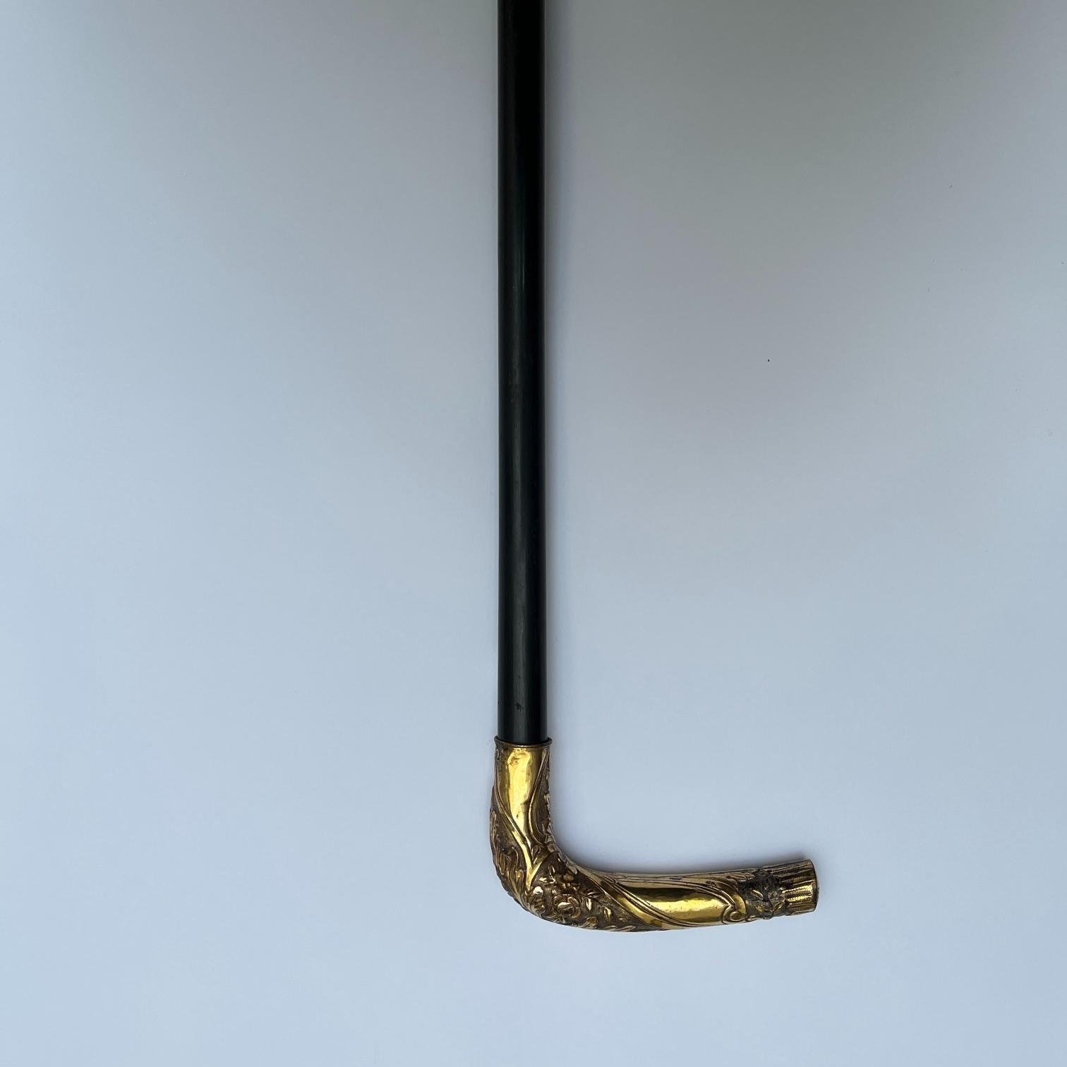 Bastón en madera ebanizada con cabo en bronce enchapado en oro decorado «hojas y flores» y regatón en bronce. Alto 92 cm.