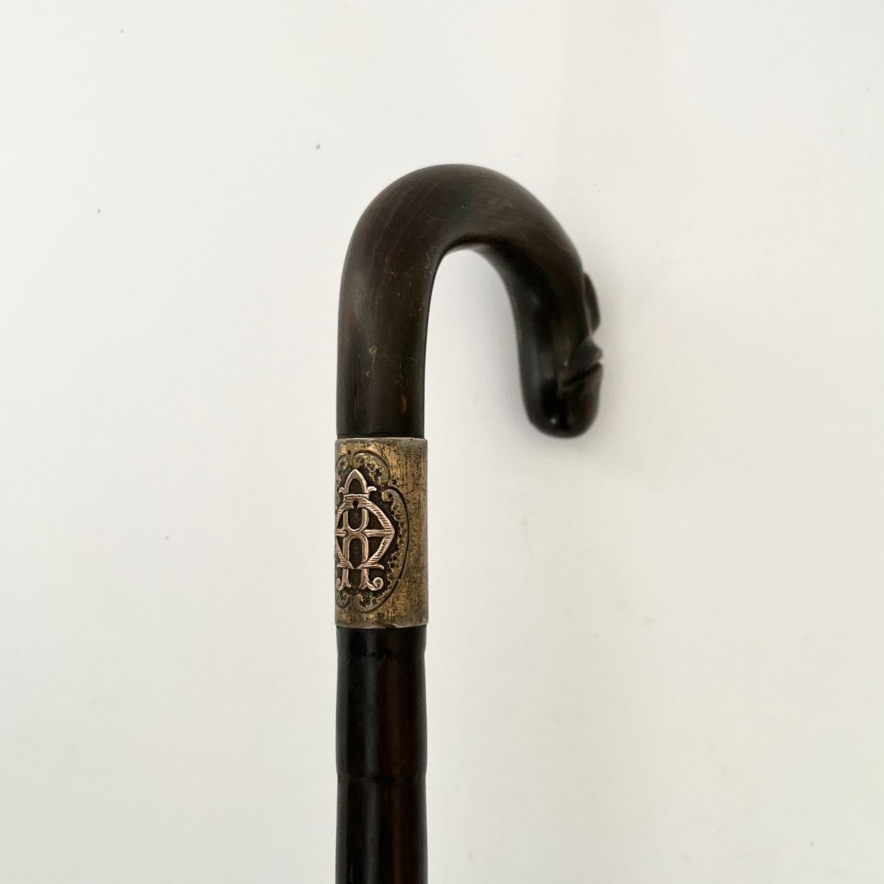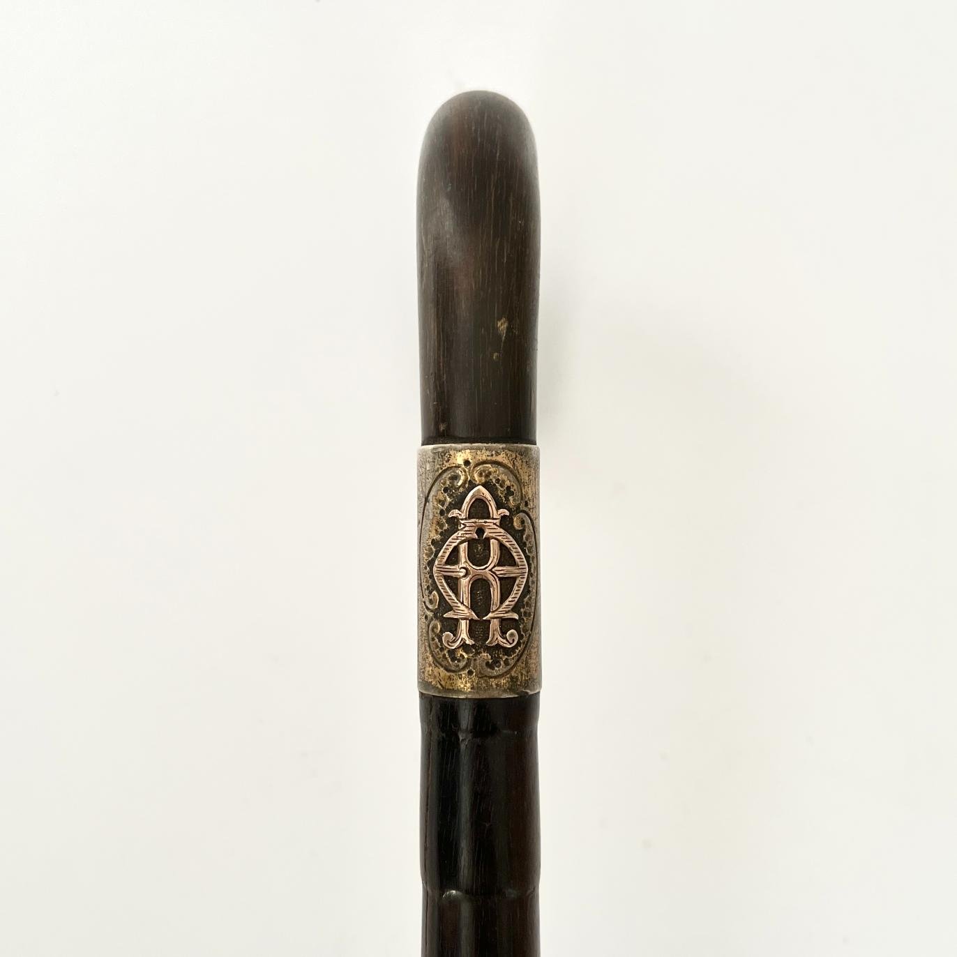 Bastón en caña malaca, con estoque. Cabo en guampa tallada, con virola en plata vermeil con monograma «R.A.» en oro. Estoque toledano con desangrador, grabado al ácido «arabescos» y «motivos militares», con secciones pavonadas. Alto 90 cm.