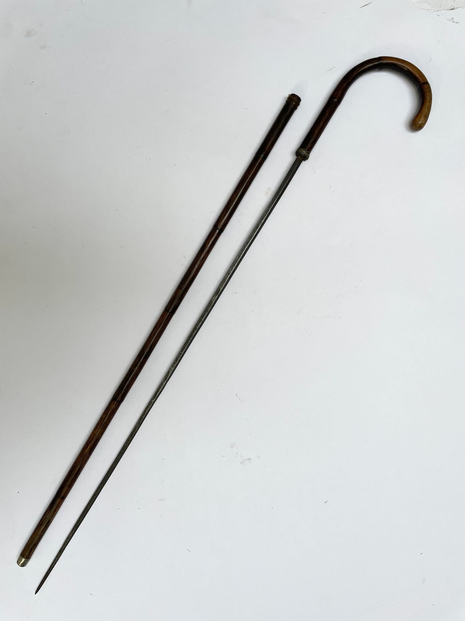 Bastón con estoque, en caña malaca, con regatón en metal y virola en hilo de plata. Hoja de cuatro caras, en hierro forjado. Alto 91 cm.