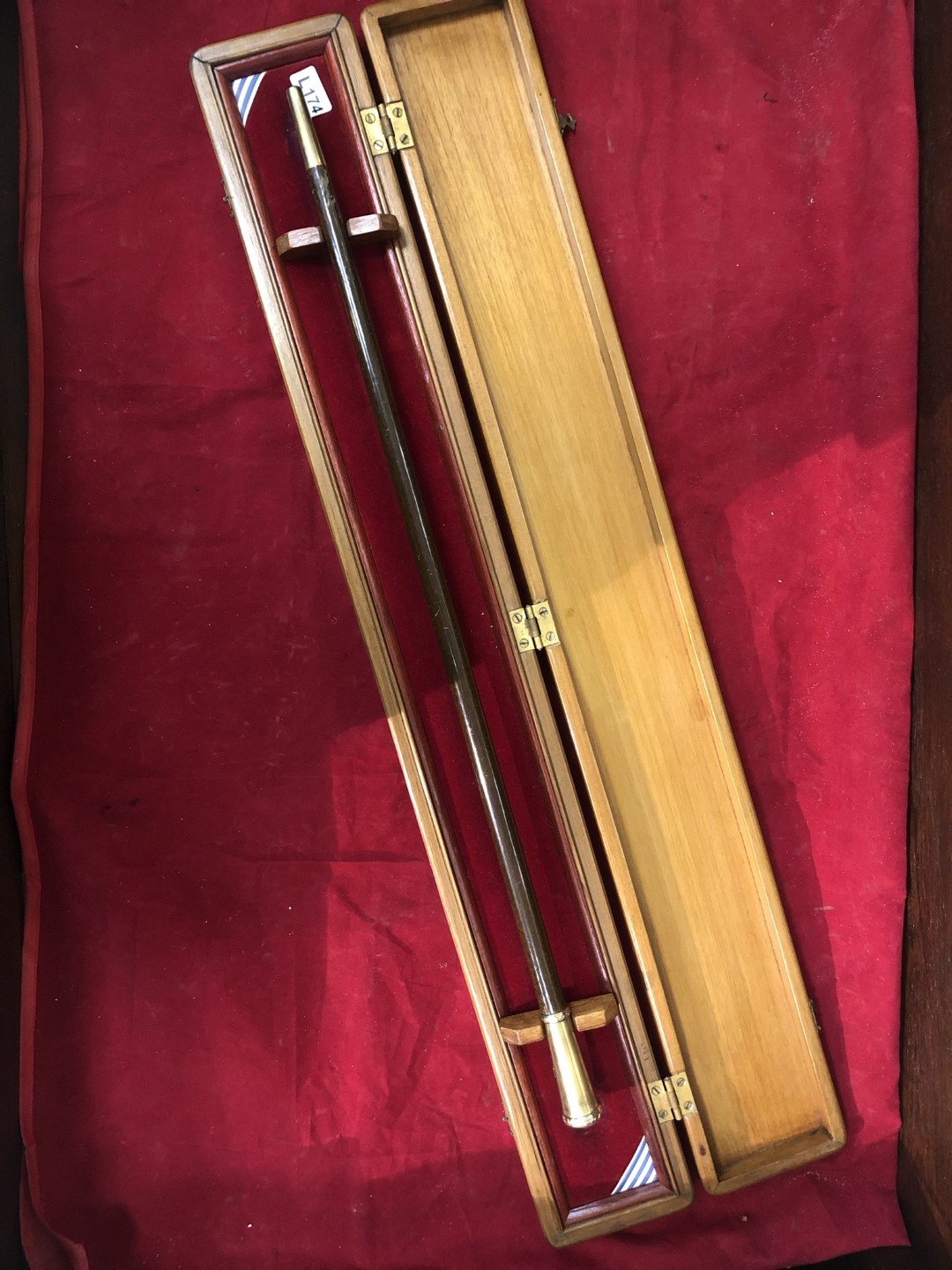 Bastón de mando en madera con puntera y cabo en bronce dorado, con escudo nacional uruguayo en esmalte e iniciales «A.L.» en oro. En estuche original en madera.