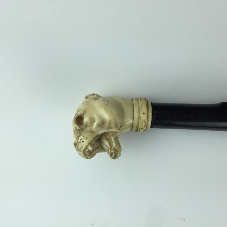 Bastón en bigote de ballena tallado tipo «rama». Pomo en marfil esculturado «cabeza de perro Boxer». Alto 83 cm.