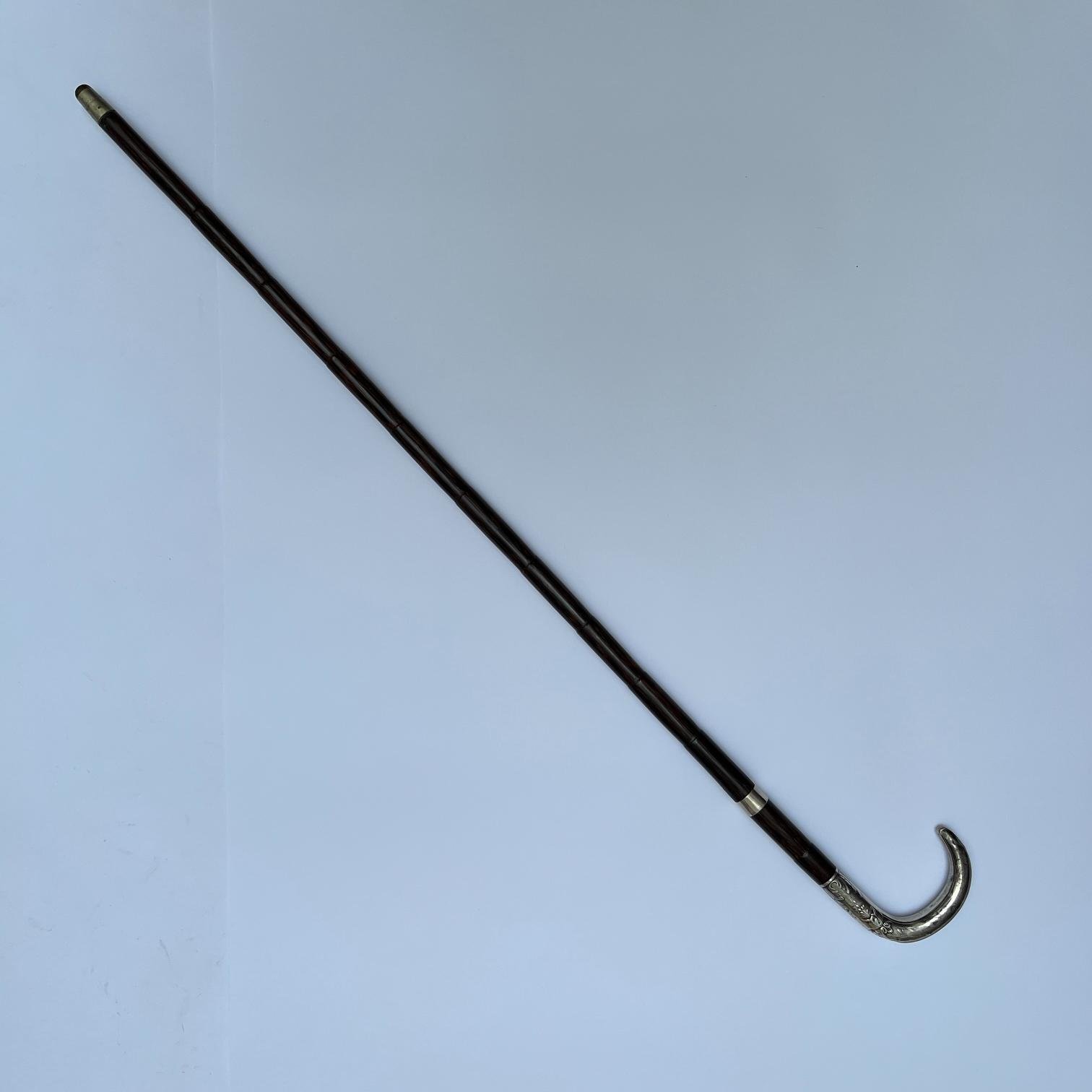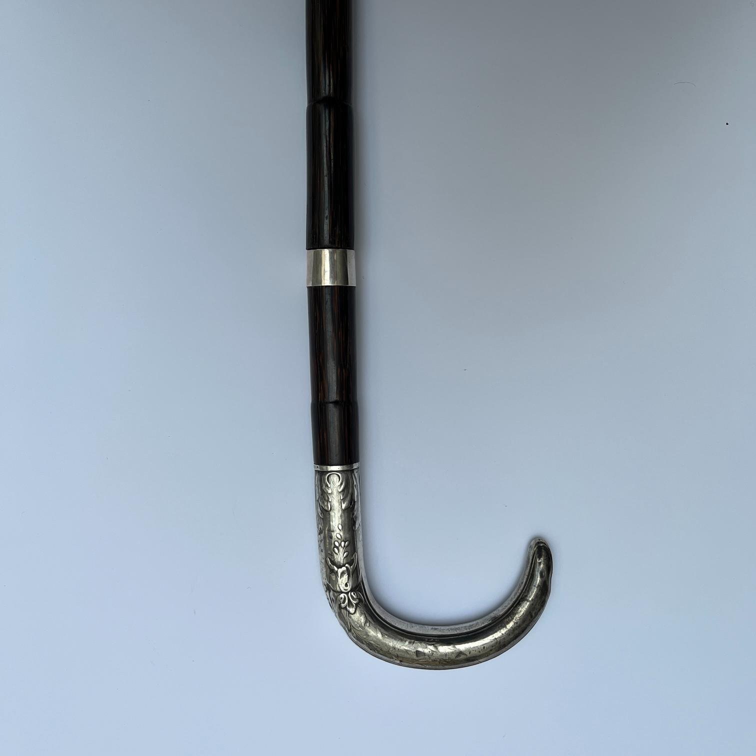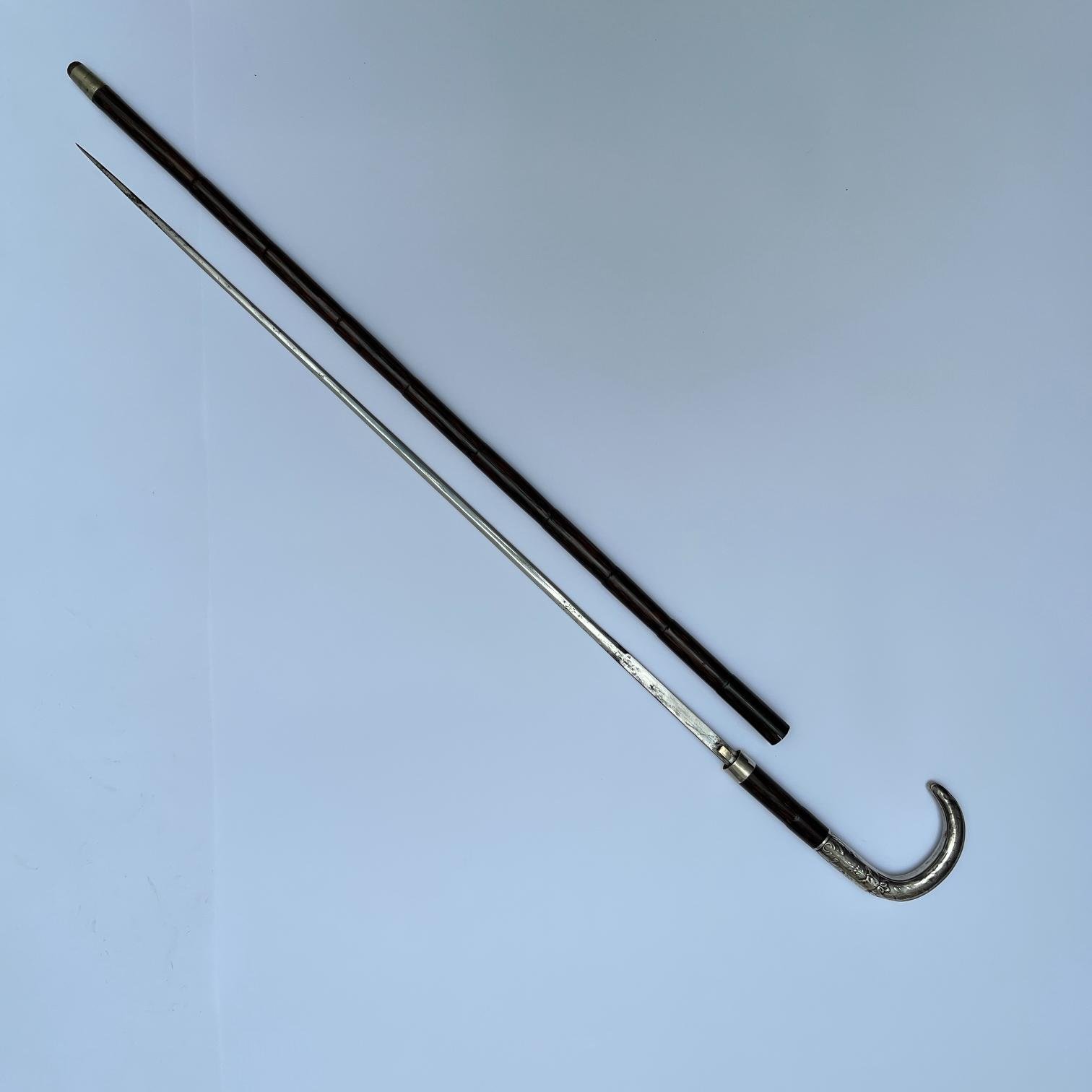 Bastón en caña con estoque en hierro forjado, con cabo en plata cincelada «hojas», virola en plata lisa y regatón en alpaca. Alto 92 cm.