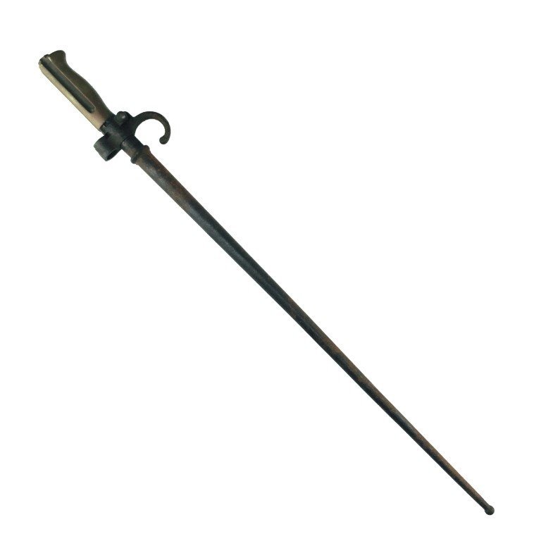 Bayoneta francesa para fusil Lebel. Hoja cruciforme. Transformada en Uruguay para fusil Daudeteau. Empuñadura en metal blanco. Vaina en hierro.