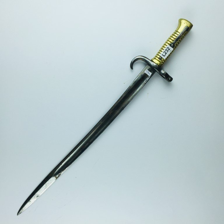 Bayoneta alemana tipo yatagán para fusil Webber. Empuñadura en bronce. Fabricada por Alex Koppel, con marcas regimentales.