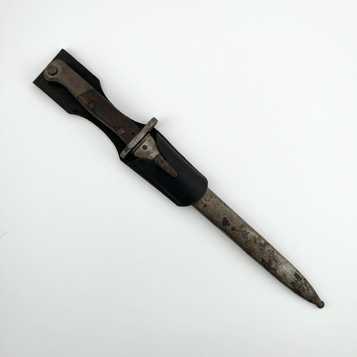 Bayoneta belga FN para fusil Mauser M1924 larga, utilizada por el ejército yugoslavo. Cachas en madera lisa y vaina en metal con tahalí en cuero. Largo total 42 cm.