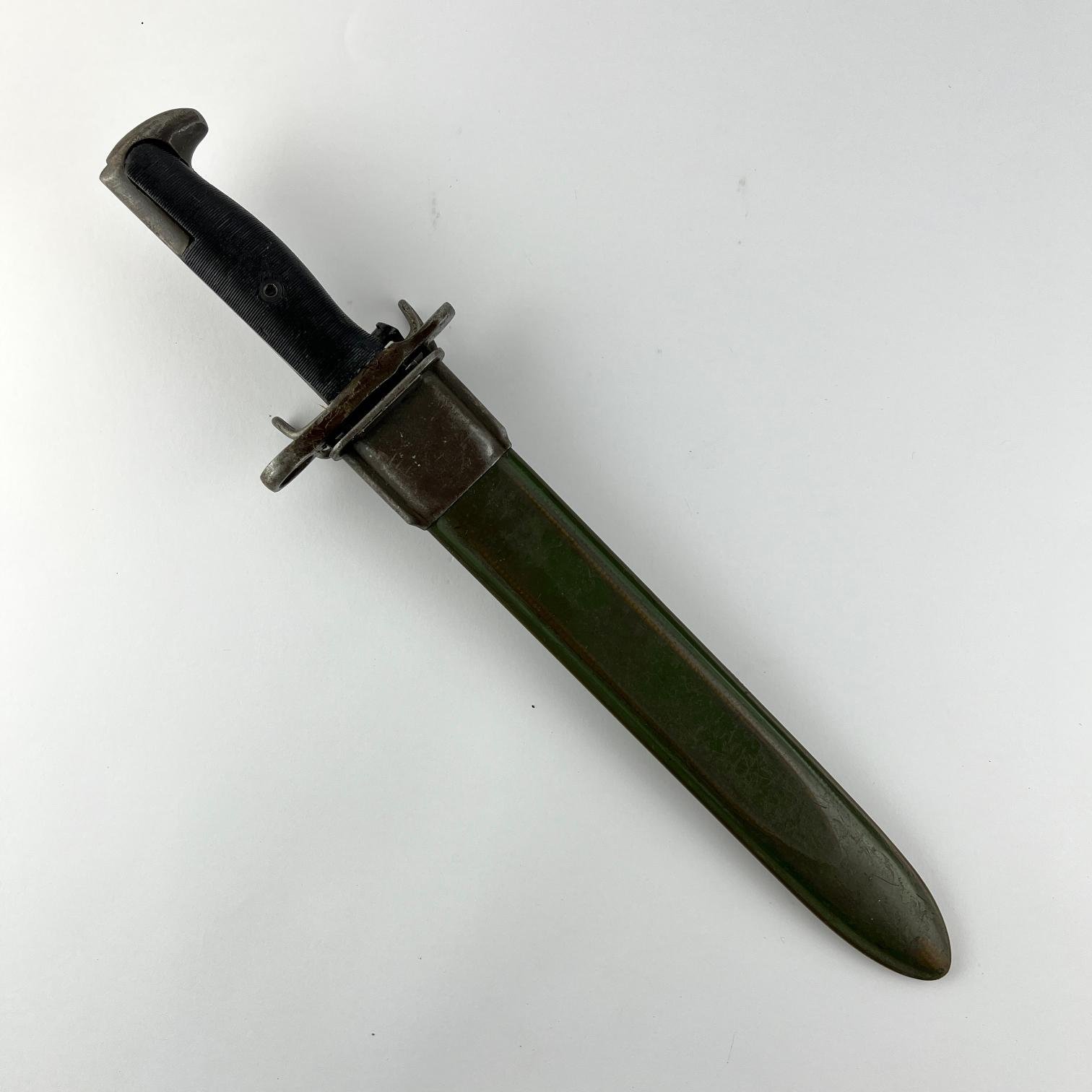 Bayoneta estadounidense US M5 para fusil M1 Garand. Empuñadura en baquelita negra. Hoja marcada «AFH US 1943». Vaina en fibra color verde, con bocavaina y puntera metálicos. Largo 29 cm.