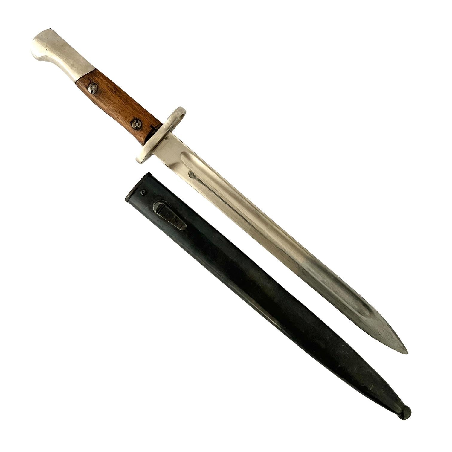 Bayoneta para Mauser M1908, modificada en la sujeción. Empuñadura en madera y metal. Vaina metálica. Largo total 43 cm.