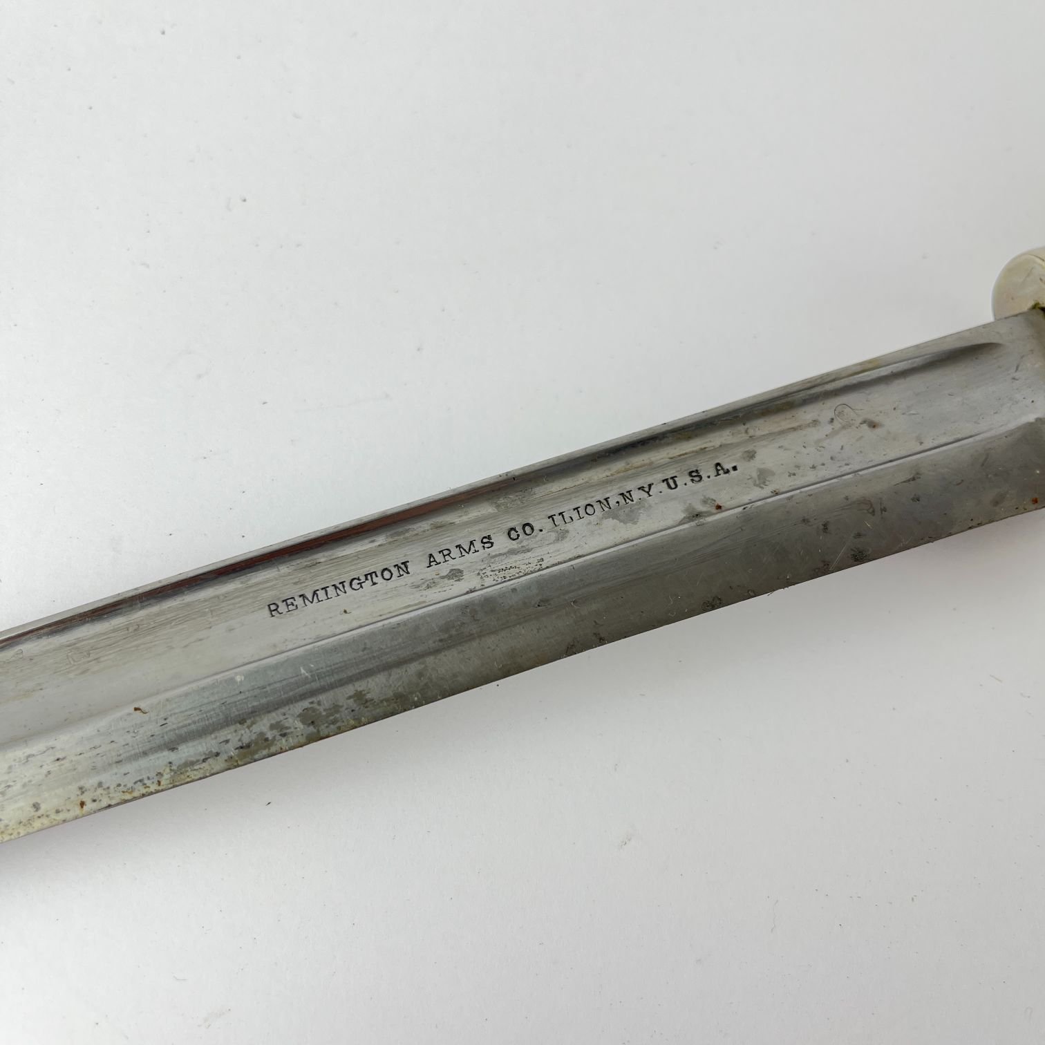 Bayoneta Remington para fusil Rolling Block modelo 1901 transformada a cuchillo por el ejército uruguayo. Cachas en asta de ciervo. Con vaina y tahalí.
