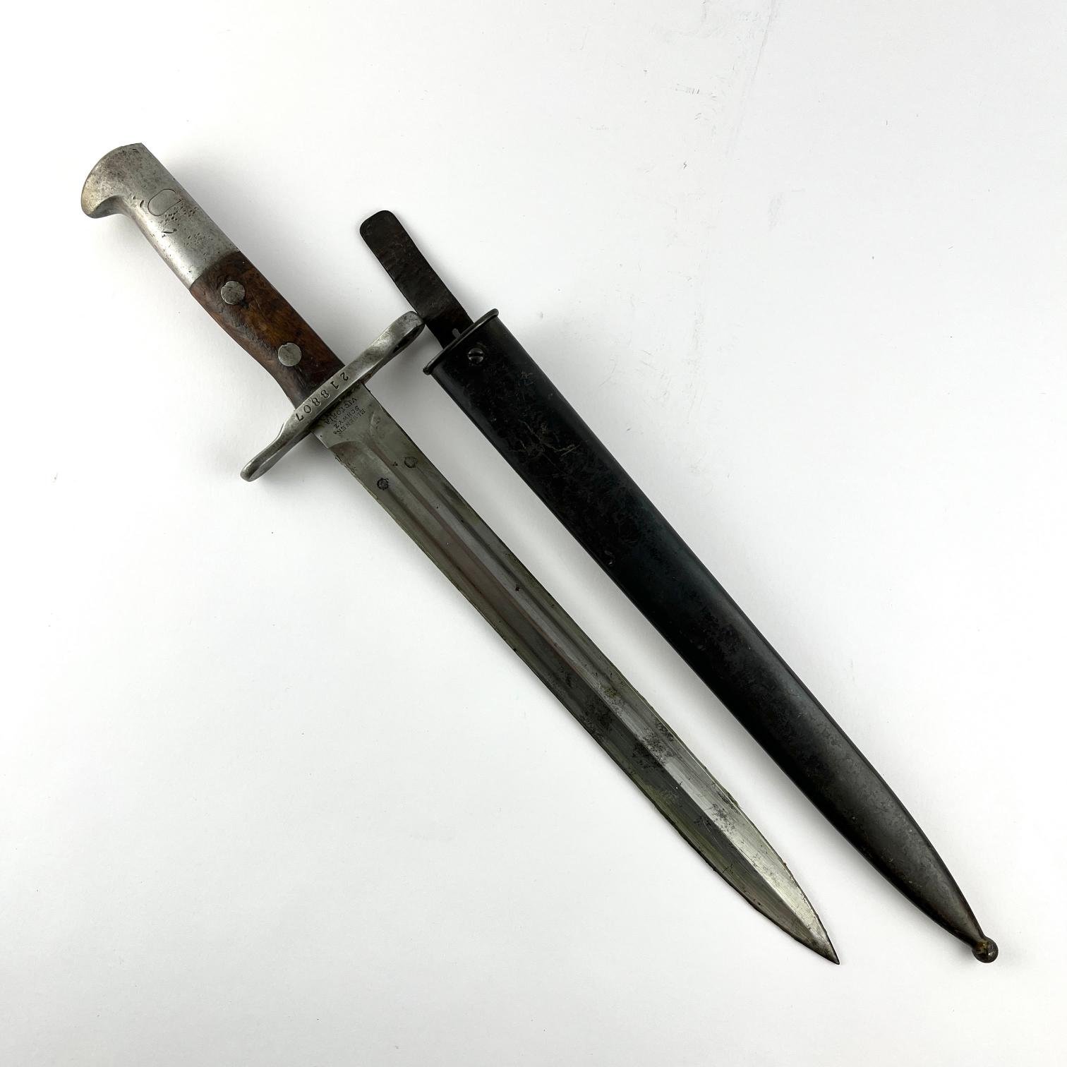 Bayoneta suiza M1889 para fusil Schmidt Rubin. Empuñadura en acero y madera. Vaina en acero pavonado. Hoja marcada «Elsener, Schwyz, Victoria». Largo 43 cm.