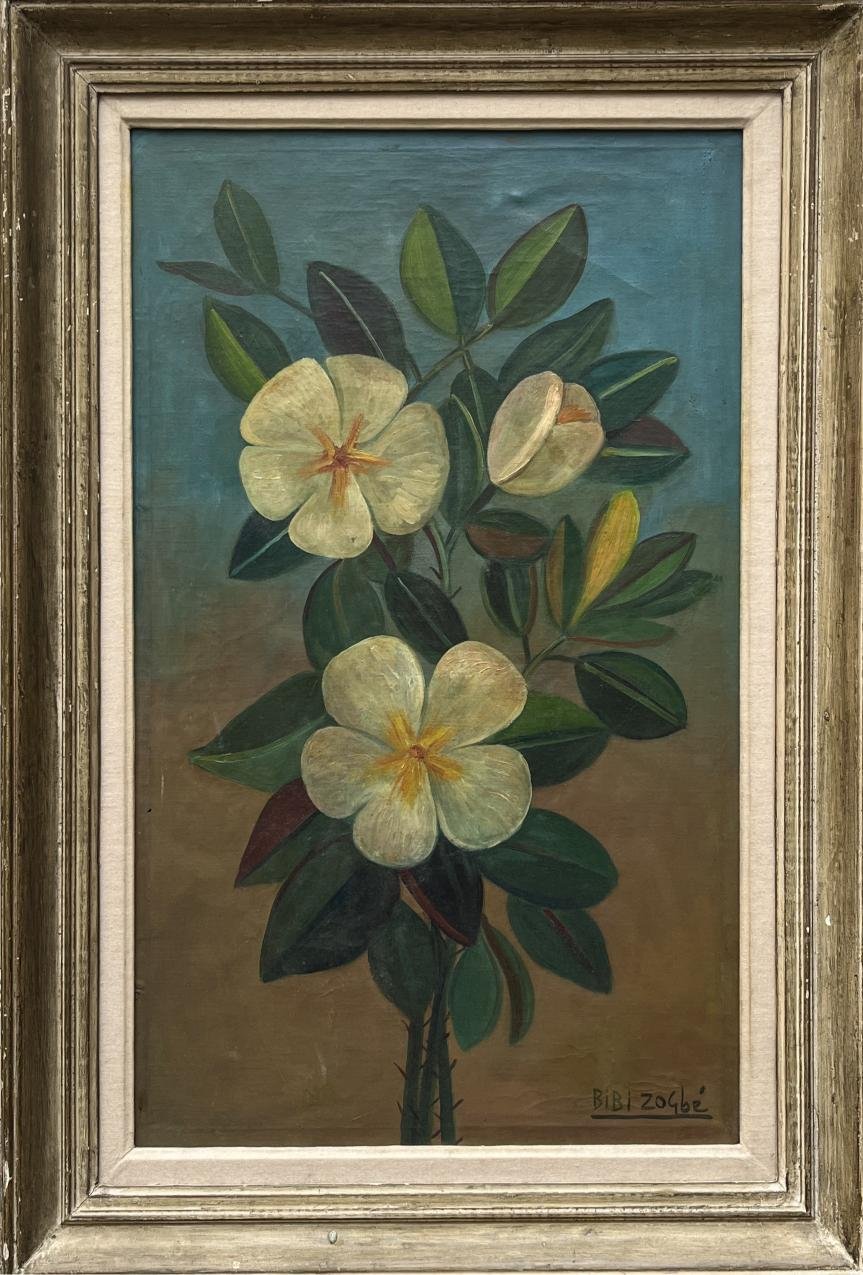 BIBÍ ZOGBÉ (Escuela libanesa, 1980-1973) Óleo sobre tela «Magnolias» Firmado abajo a la derecha Al dorso vuelto a firmar 80 x 49 cm