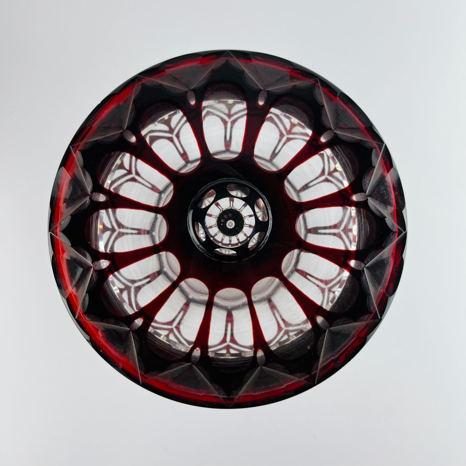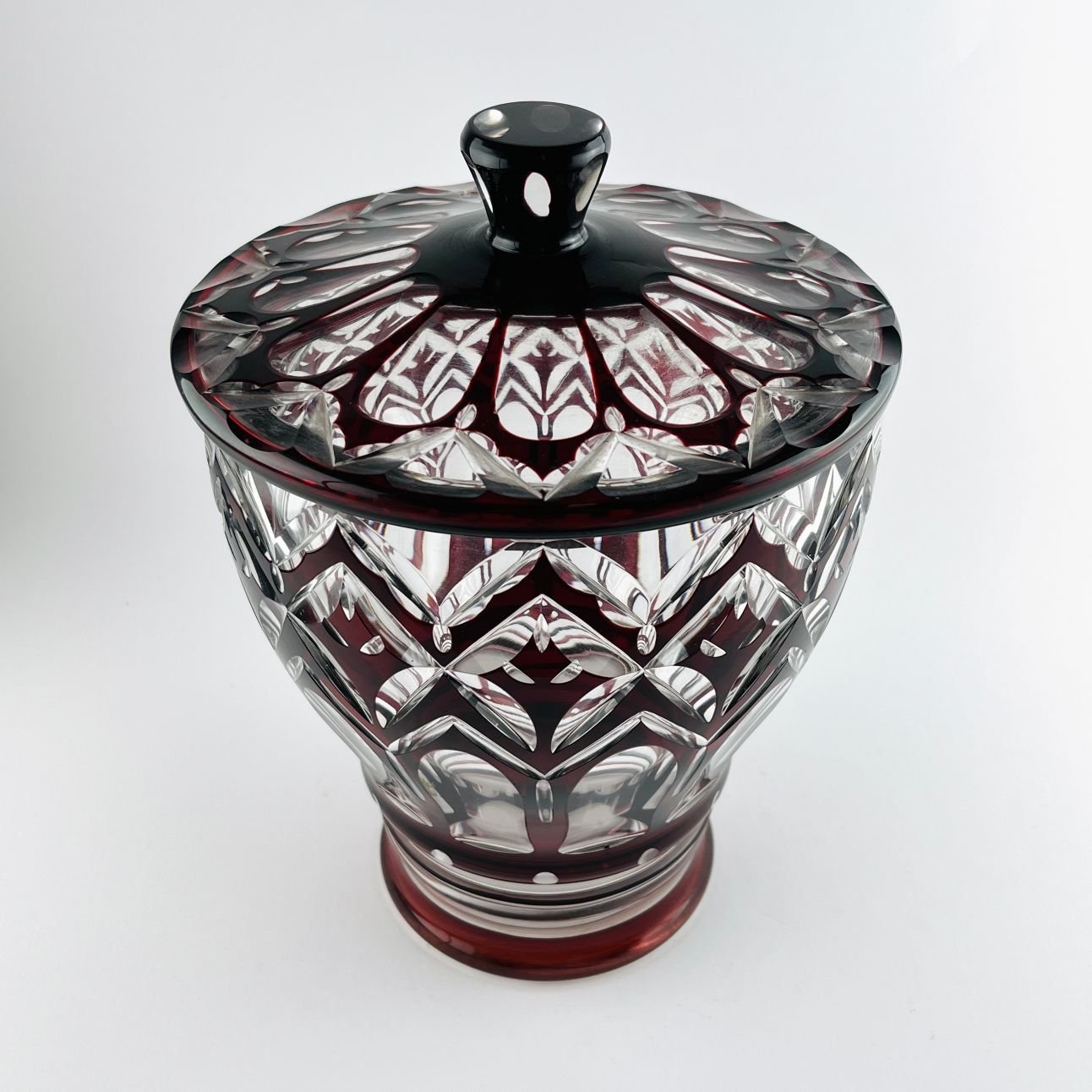 Bizcochera en cristal tallado color bordeaux. 18 x 20 cm.