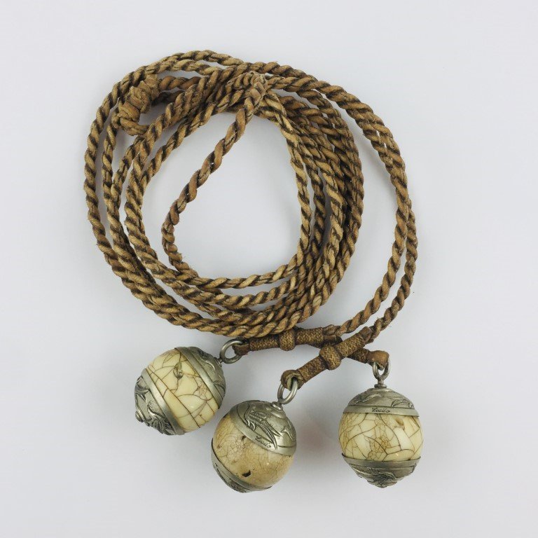 Juego de tres boleadoras en pasta, con monturas en plata cincelada «aves». Firmadas Lucilo. Tientos en cuero crudo trenzado, rematados en fino cuero trenzado. Diámetro de boleadora 5 cm.