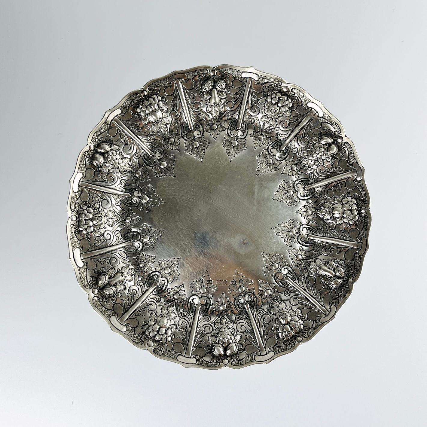 Bombonera inglesa en plata de Birmingham año 1890, repujada y cincelada «frutos y flores». 12.5 x 19 cm. Peso 420 gr. Presenta pequeña avería.