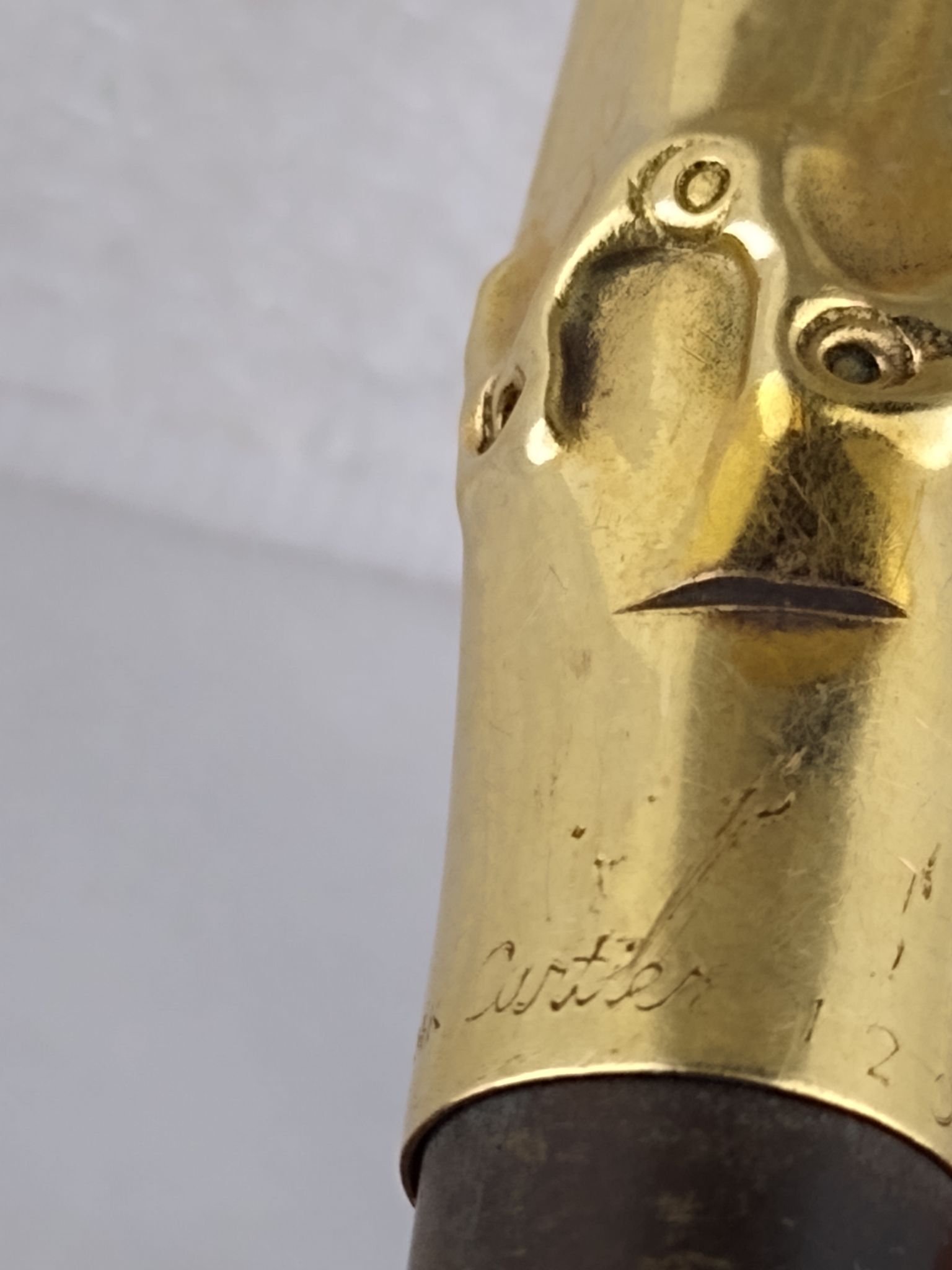 Boquilla para fumar en oro 14 K amarillo y baquelita, esculturado «caña». Firmada Cartier y numerada 12001. Largo 9 cm.
