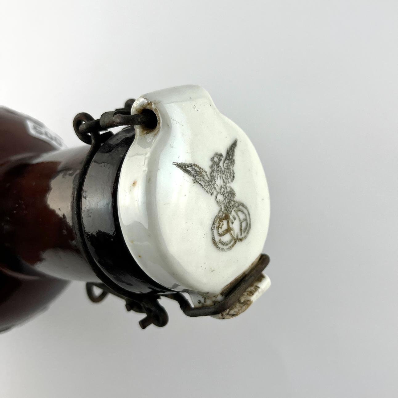 Botella de cerveza uruguaya en vidrio prensado. “Cervecería Oriental “, con tapón en alambre y cerámica. Alto 26 cm.