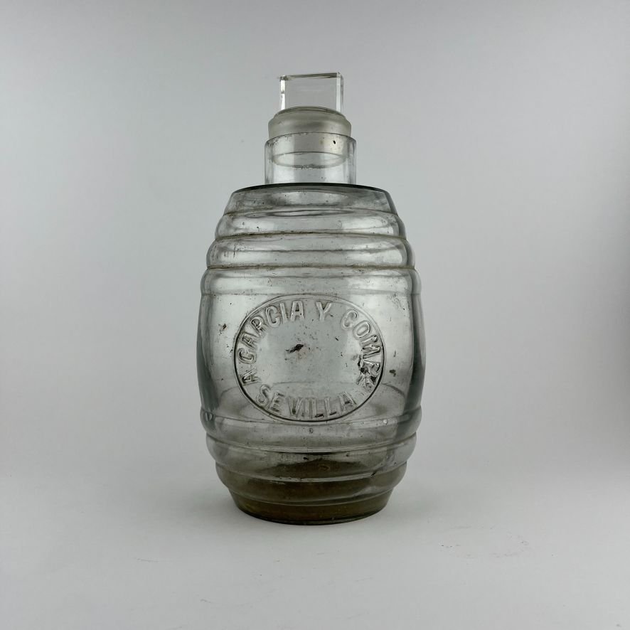 Botella en forma de barril, en vidrio prensado, con inscripción «A. García y Comp. Sevilla», con tapón. Alto 26 cm.